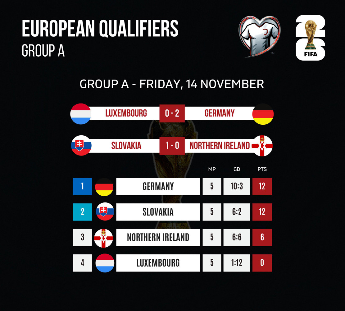 Cục diện căng thẳng ở bảng A, khi Đức dẫn đầu với 12 điểm, chỉ hơn Slovakia chỉ số phụ. Ở lượt đấu cuối, Đức sẽ đá "chung kết" của bảng đấu tranh tấm vé trực tiếp dự VCV World Cup 2026 với Slovakia trên sân Red Bull Arena (rạng sáng 18/11, giờ VN)
