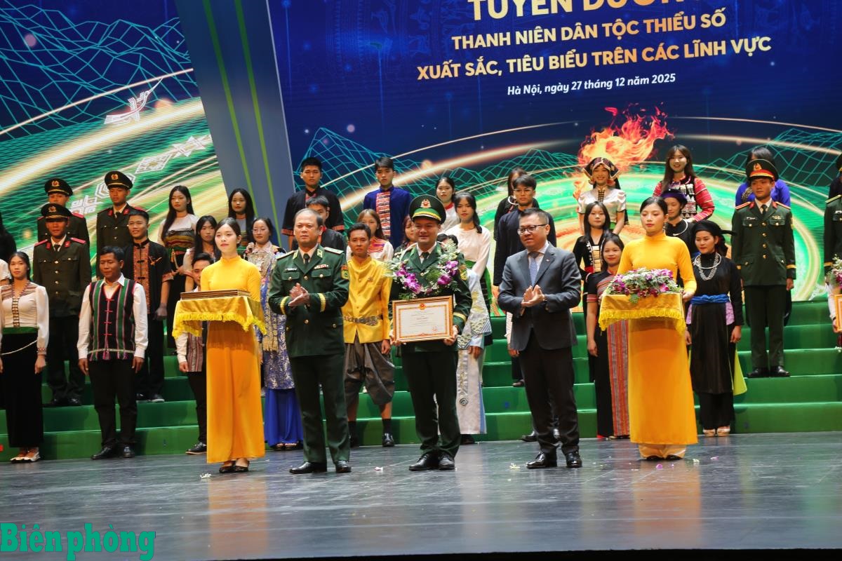 Trung tướng Nguyễn Anh Tuấn, Bí thư Đảng ủy, Chính ủy Bộ đội Biên phòng và đồng chí Lê Quốc Minh, Tổng Biên tập Báo Nhân Dân, Phó trưởng ban Tuyên giáo và Dân vận Trung ương trao tặng Bằng khen cho các thanh niên dân tộc thiểu số xuất sắc trên các lĩnh vực. Ảnh: Cẩm Linh