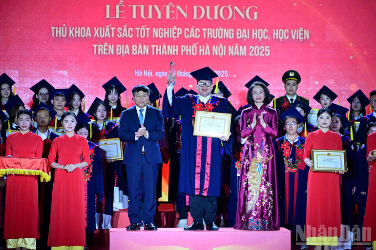 Đại diện lãnh đạo thành phố Hà Nội và các ban, bộ, ngành, đoàn thể Trung ương, địa phương cùng những thủ khoa xuất sắc của Thủ đô được tuyên dương năm nay.