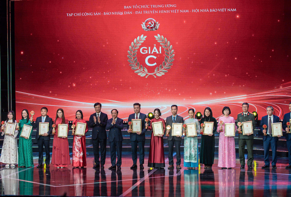 Đồng chí Nguyễn Duy Ngọc, Ủy viên Bộ Chính trị, Bí thư Thành ủy Hà Nội và đồng chí Trịnh Văn Quyết, Ủy viên Bộ Chính trị, Trưởng Ban Tuyên giáo và dân vận Trung ương trao giải C cho các tác giả, nhóm tác giả.