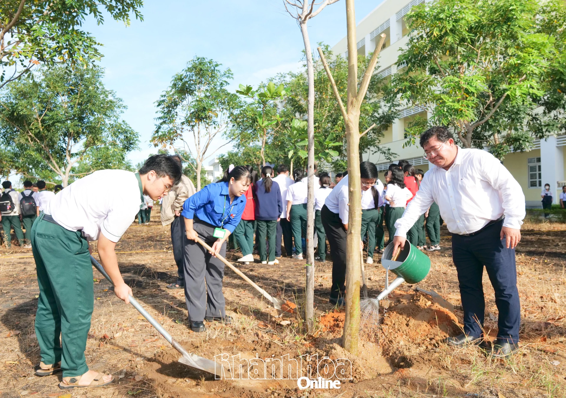 Ông Châu Ngô Anh Nhân cùng đoàn viên và học sinh trồng cây xanh trong khuôn viên trường.