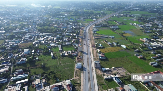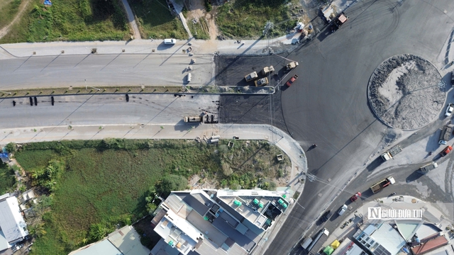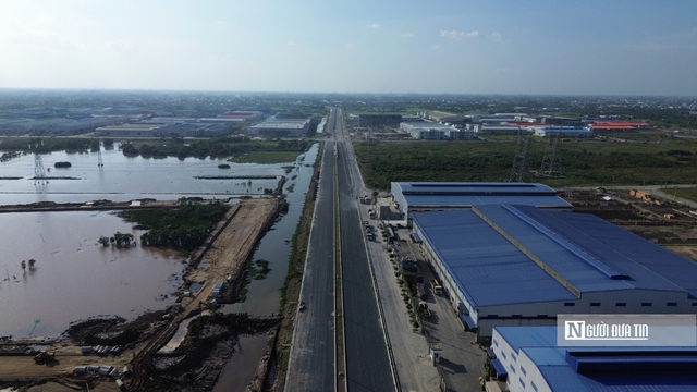 Từ góc nhìn trên cao, tuyến đường hiện rõ với lớp móng cấp phối đá dăm đã hoàn thiện, nhiều đoạn đã được thảm bê tông nhựa, nổi bật giữa đồng ruộng, khu công nghiệp hai bên, tạo nên diện mạo hạ tầng hoàn toàn mới cho khu vực.