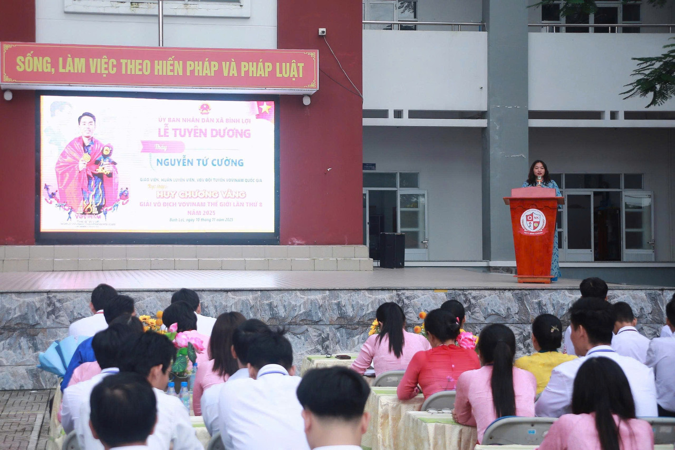 Phát biểu tại buổi lễ, bà Nguyễn Thị Hương Thảo - Phó Chủ tịch UBND xã Bình Lợi - nhấn mạnh, trong không khí hân hoan chào mừng kỷ niệm 43 năm Ngày Nhà giáo Việt Nam (20/11/1982–20/11/2025), địa phương càng tự hào hơn khi cùng nhau vinh danh một tấm gương nhà giáo tiêu biểu, người đã mang vinh quang về cho đất nước, cho nhà trường và cho quê hương Bình Lợi thân yêu.