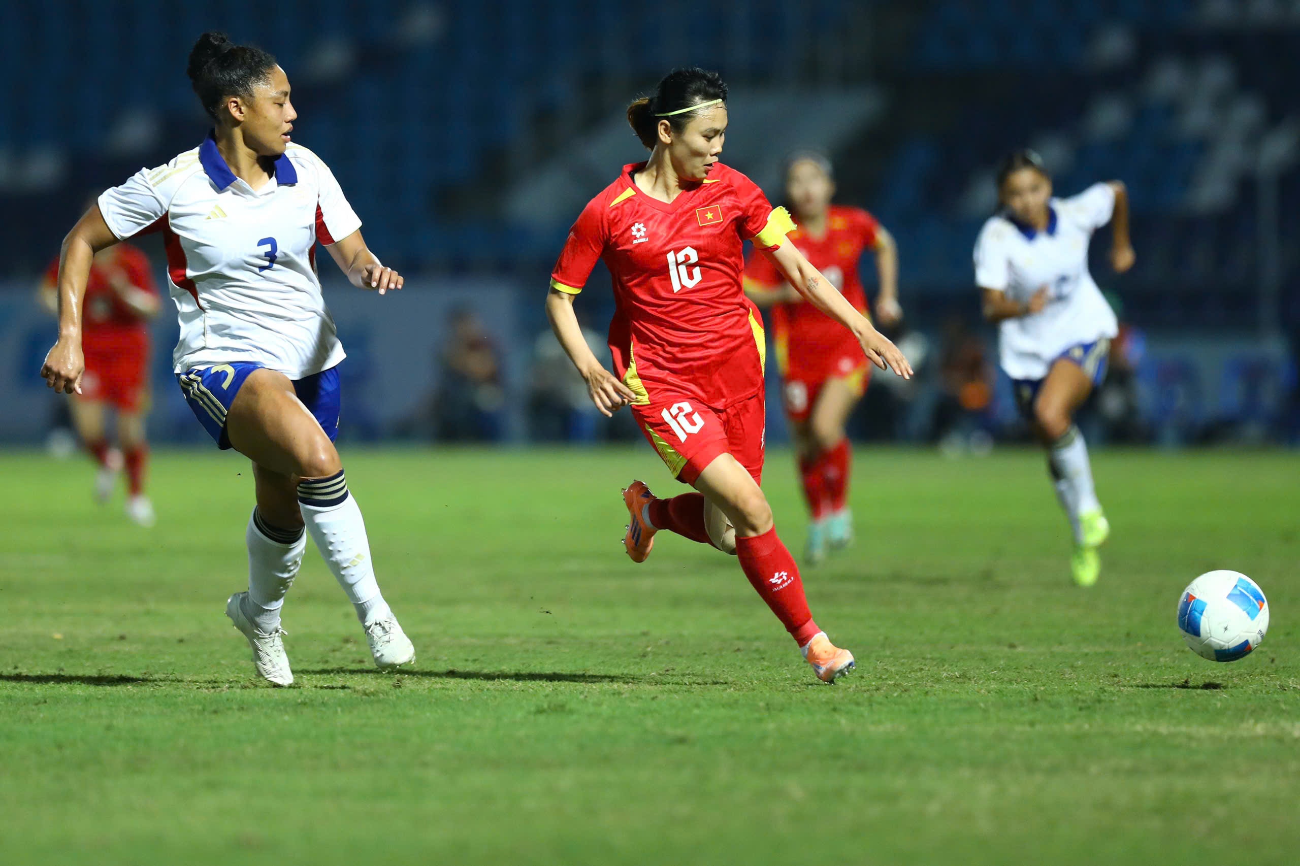 Phút 11, hàng thủ Philippines bất ngờ mắc sai sót, mở ra khoảng trống cho Bích Thùy. Số 23 nỗ lực dứt điểm bằng lòng trong chân phải nhưng vẫn chưa thể mang về bàn mở tỷ số cho tuyển nữ Việt Nam.