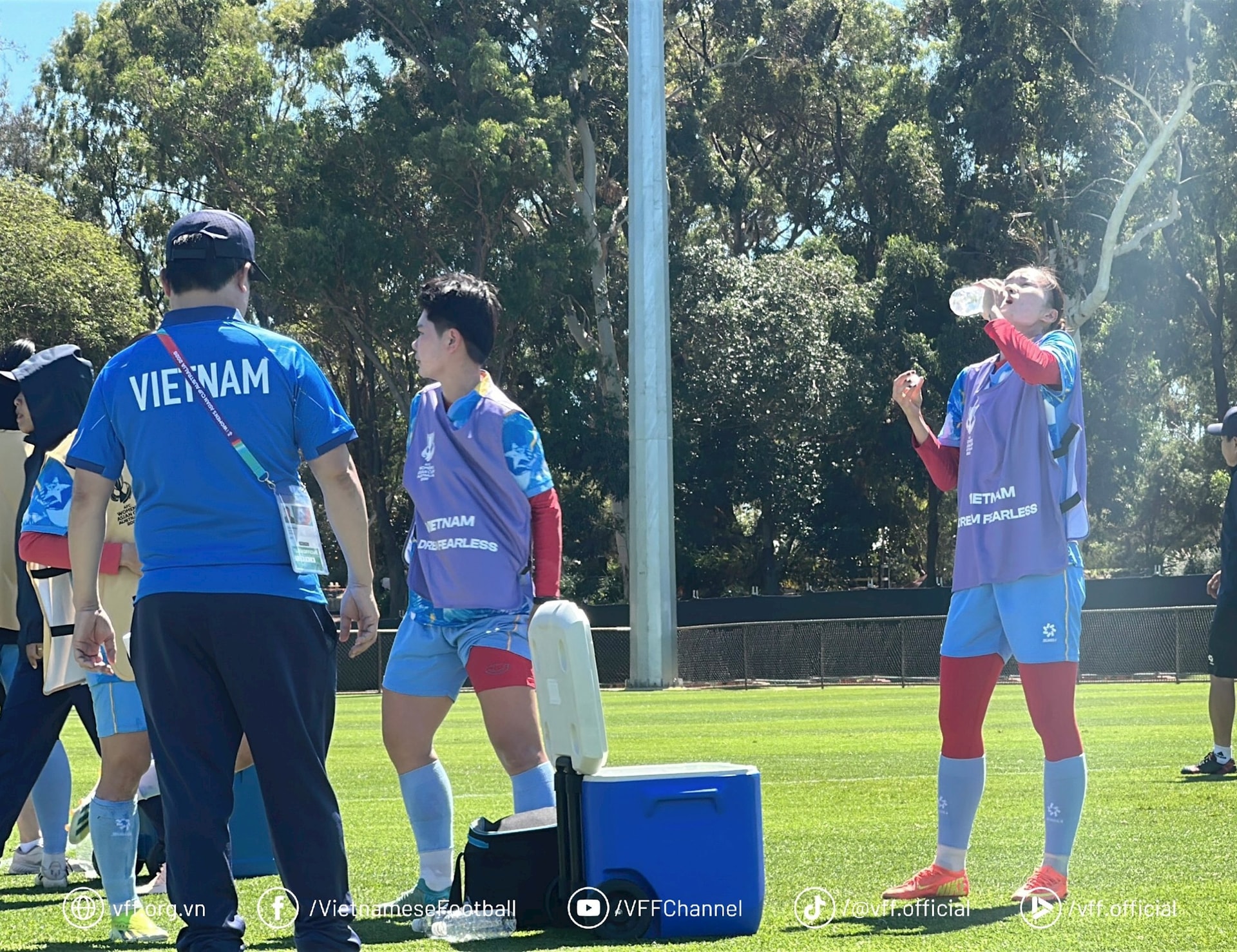 Các cầu thủ tiếp nước giữa buổi tập. Ảnh VFF
