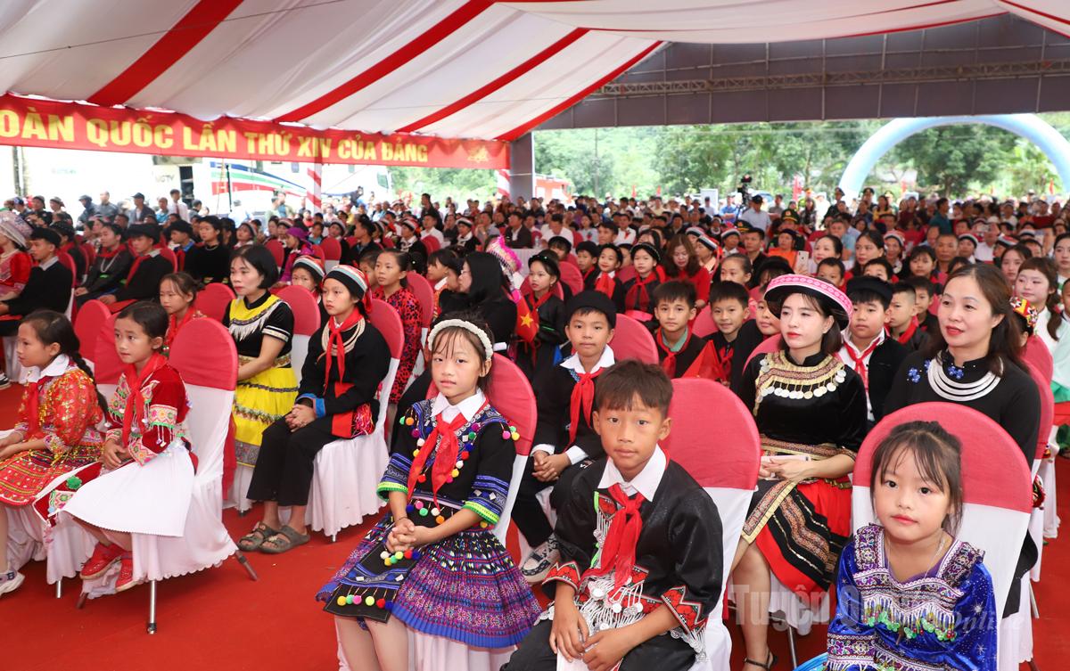 Các em học sinh xã Sơn Vĩ tới tham dự, chung vui trong Lễ khởi công xây dựng Trường Phổ thông nội trú liên cấp Tiểu học và THCS Sơn Vĩ. Ảnh: Duy Tuấn
