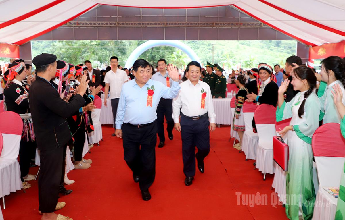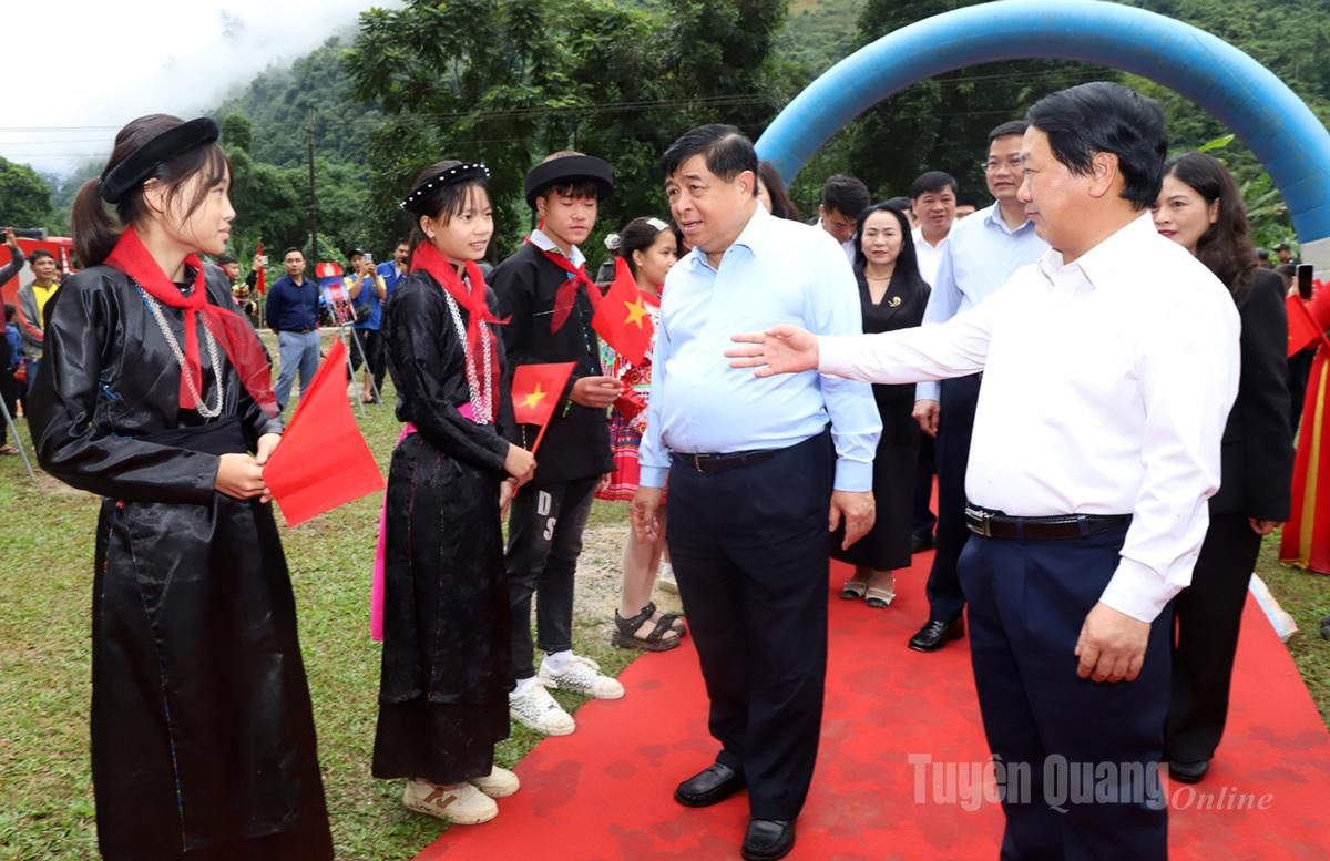 Phó Thủ tướng Chính phủ Nguyễn Chí Dũng và Bí thư Tỉnh ủy Hầu A Lềnh tới dự Lễ khởi công Trường Phổ thông Nội trú liên cấp Tiểu học và Trung học cơ sở Minh Tân. Ảnh: Văn Nghị