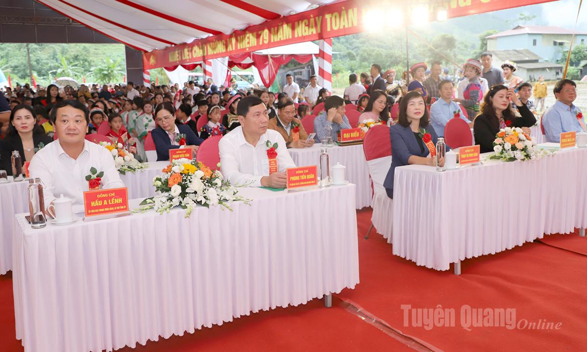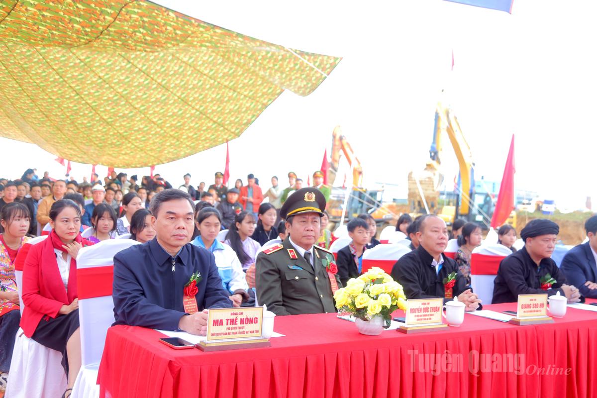 Phó Bí thư Tỉnh ủy, Chủ tịch Ủy ban MTTQ Việt Nam tỉnh Ma Thế Hồng và Thiếu tướng Nguyễn Đức Thuận, Ủy viên BTV Tỉnh ủy, Giám đốc Công an tỉnh dự Lễ khởi công Trường nội trú liên cấp tại xã Xín Mần. Ảnh: Văn Long