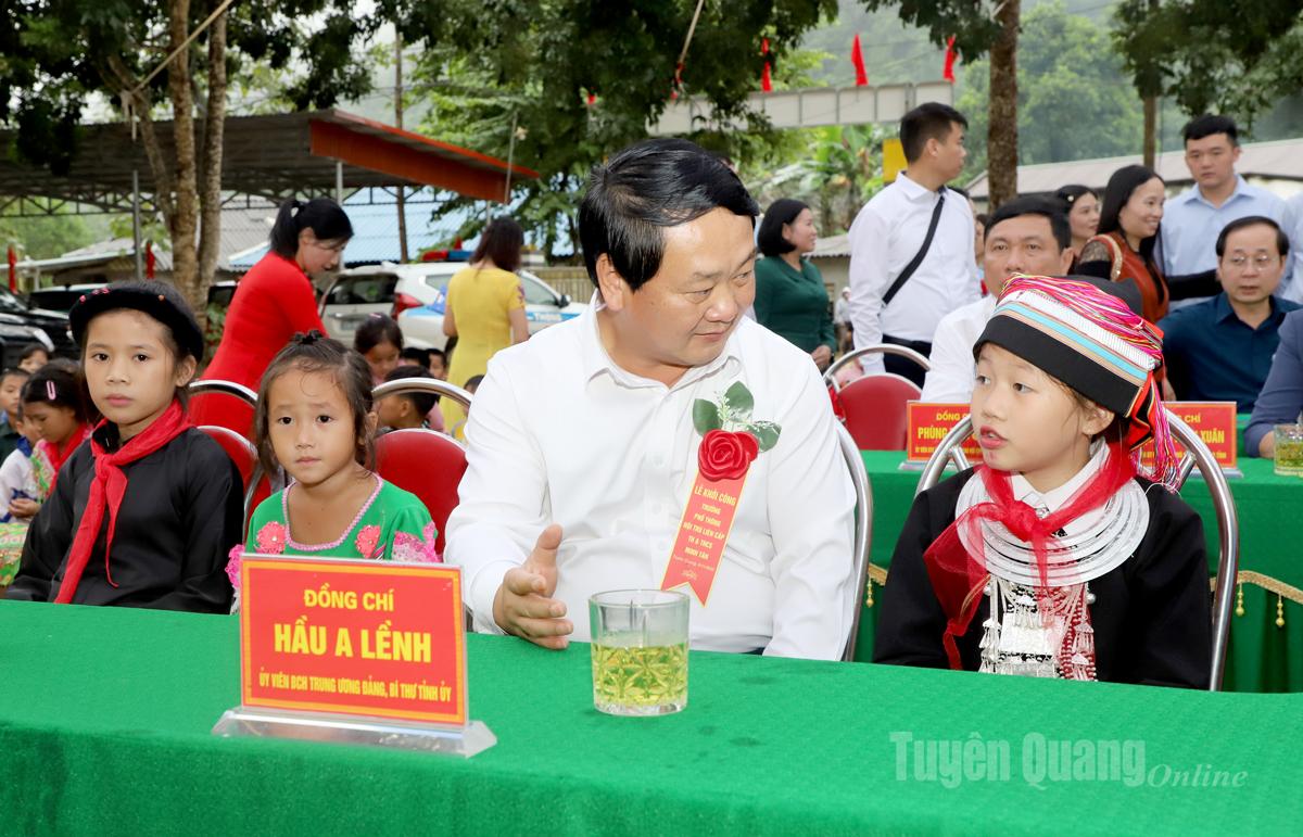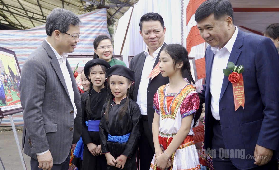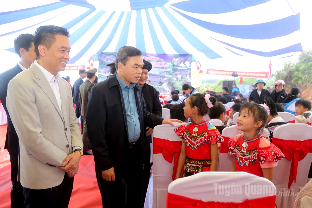 Đồng chí Nguyễn Văn Sơn, Phó Bí thư Tỉnh ủy, Chủ tịch HĐND tỉnh cùng các đại biểu trò chuyện với học sinh xã Pà Vầy Sủ tại Lễ khởi công. Ảnh: Hồng Nhung
