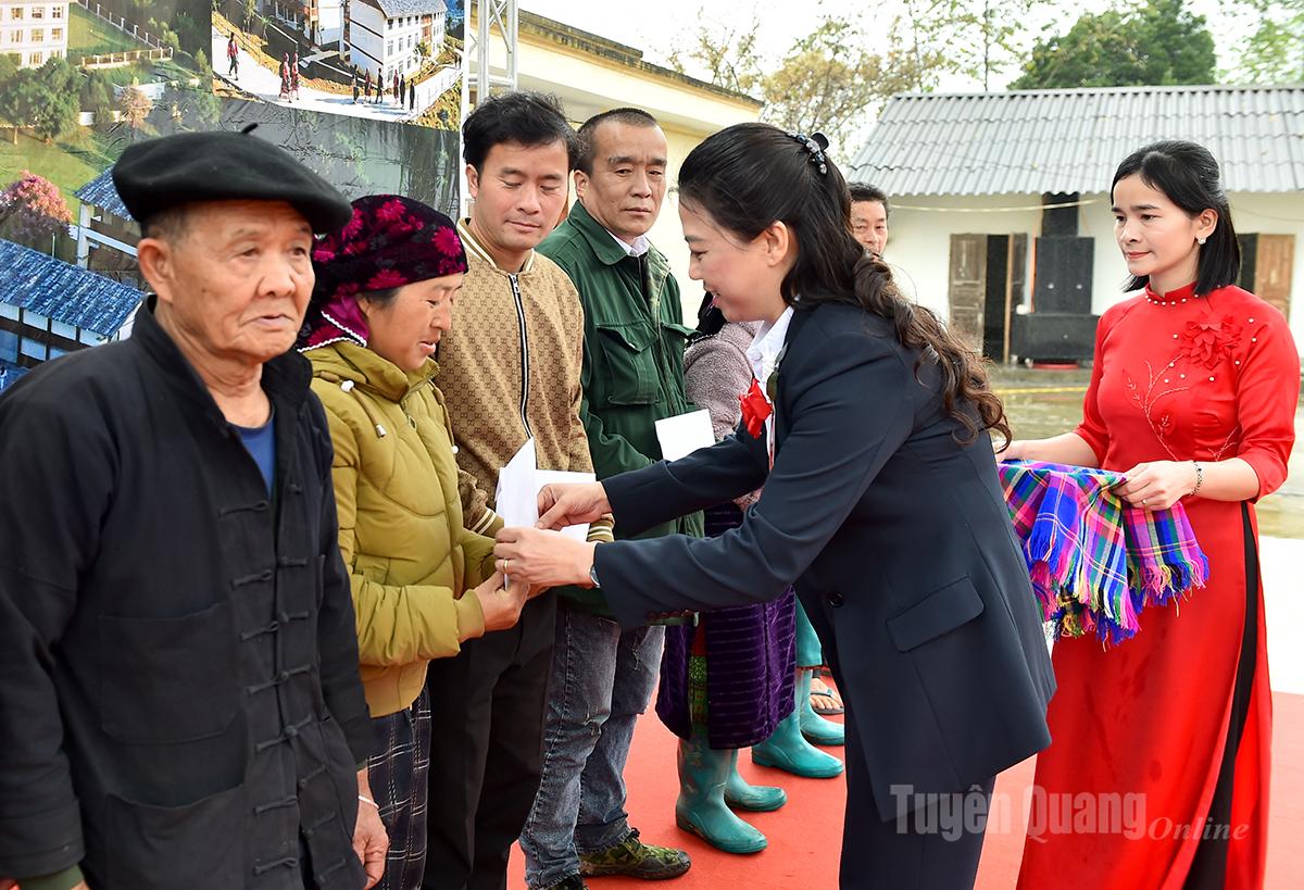 Đồng chí Lê Thị Kim Dung, Phó Bí thư Thường trực Tỉnh ủy tặng quà các hộ thuộc diện giải phóng mặt bằng xây dựng trường. Ảnh: Thanh Phúc