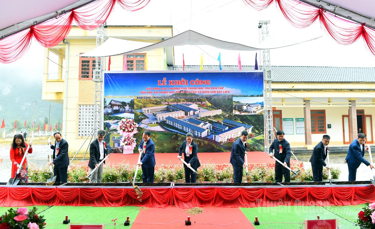 Phó Thủ tướng Chính phủ Nguyễn Chí Dũng và Bí thư Tỉnh ủy Hầu A Lềnh cùng các đại biểu khởi công Trường Phổ thông Nội trú liên cấp Tiểu học và Trung học cơ sở Minh Tân. Ảnh: Văn Nghị