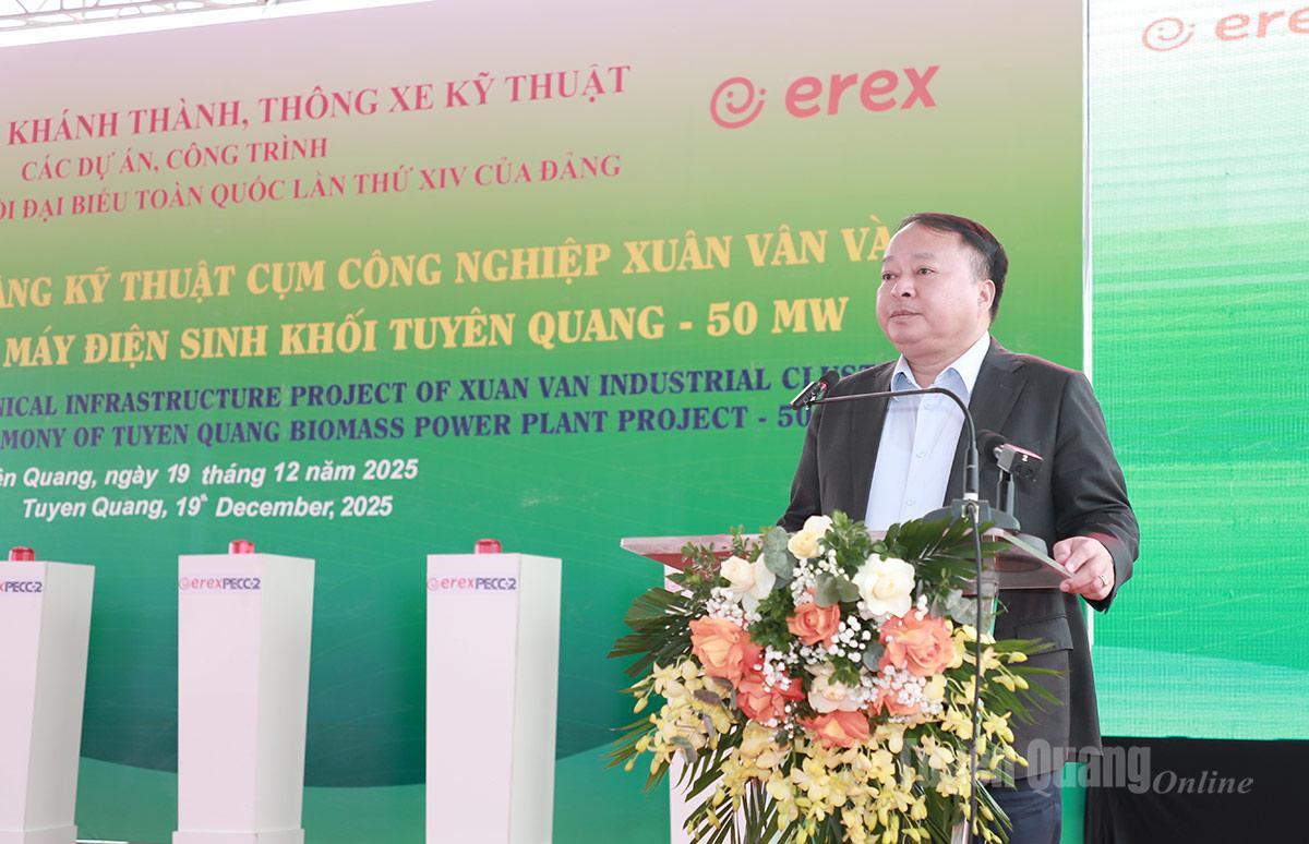 Đối với dự án đầu tư xây dựng Nhà máy Điện sinh khối và hệ thống đường dây truyền tải, công suất thiết kế 50 MW điện sinh khối nằm tại Cụm công nghiệp Xuân Vân có mức đầu tư trên 2.938 tỷ đồng; dự kiến đến Quý I/2028 hoàn thành thi công toàn bộ dự án, đưa vào vận hành thương mại. Dự án do Tập đoàn Erex đầu tư, sử dụng công nghệ nhiệt điện ngưng hơi hiện đại, vận hành bằng nhiên liệu sinh khối từ phụ phẩm nông – lâm nghiệp địa phương. Dự án không chỉ góp phần giảm phát thải khí nhà kính mà còn tạo thêm sinh kế cho người dân, thúc đẩy kinh tế tuần hoàn và phát triển xanh tại tỉnh Tuyên Quang.