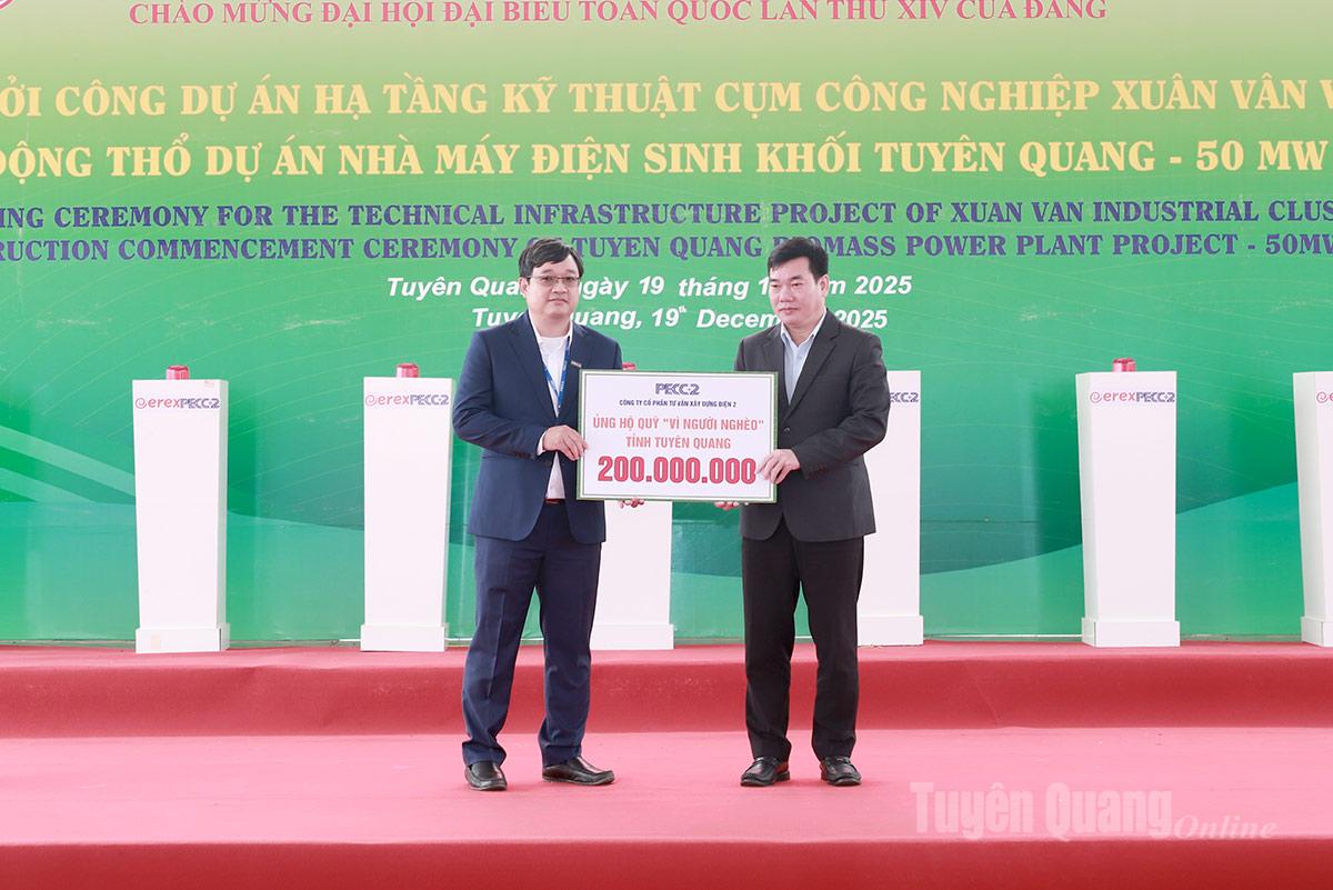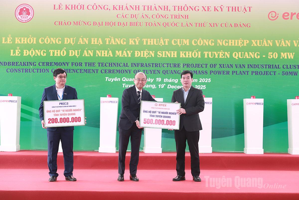 Nhân dịp này, Tập đoàn Erex Nhật Bản ủng hộ 500 triệu đồng, Công ty PECC2 ủng hộ 200 triệu đồng cho Quỹ “Vì người nghèo” của tỉnh Tuyên Quang, nhằm chung tay giúp đỡ những hộ nghèo, cận nghèo và gia đình có hoàn cảnh khó khăn trên địa bàn tỉnh nhất là trong dịp Tết Nguyên đán Bính Ngọ đang đến gần.