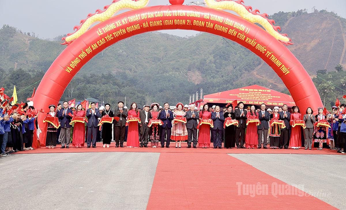 Phó Chủ tịch Thường trực Quốc hội Đỗ Văn Chiến và Bí thư Tỉnh ủy Hầu A Lềnh cùng các đồng chí lãnh đạo, nguyên lãnh đạo tỉnh thực hiện nghi thức thông xe kỹ thuật Dự án cao tốc Tuyên Quang - Hà Giang giai đoạn 1