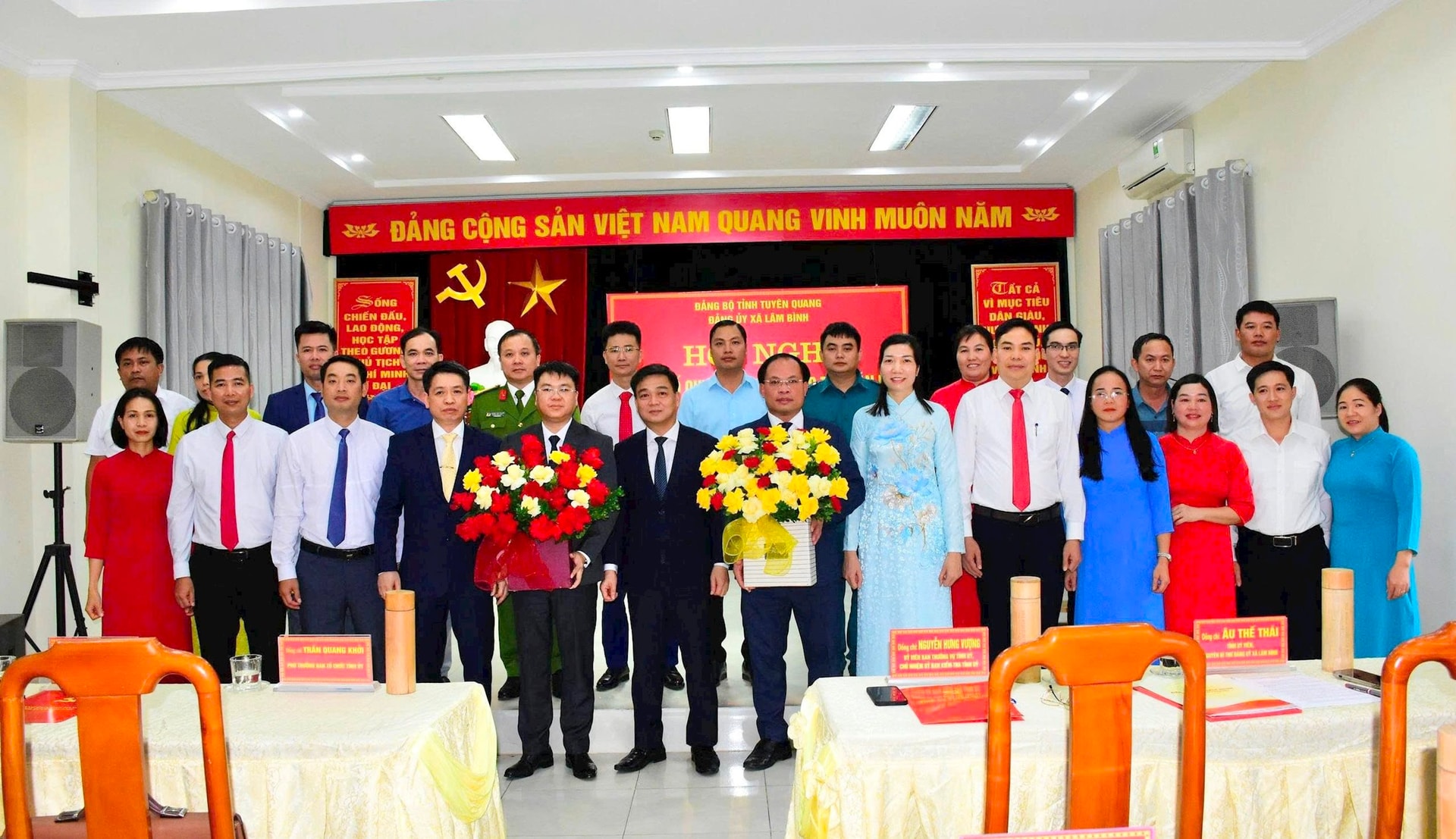 Lãnh đạo tỉnh Tuyên Quang và các đồng chí trong Ban Chấp hành Đảng bộ xã Lâm Bình tặng hoa chúc mừng 2 đồng chí nhận nhiệm vụ mới.