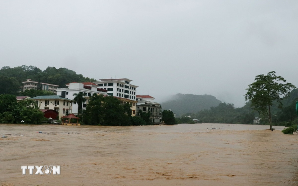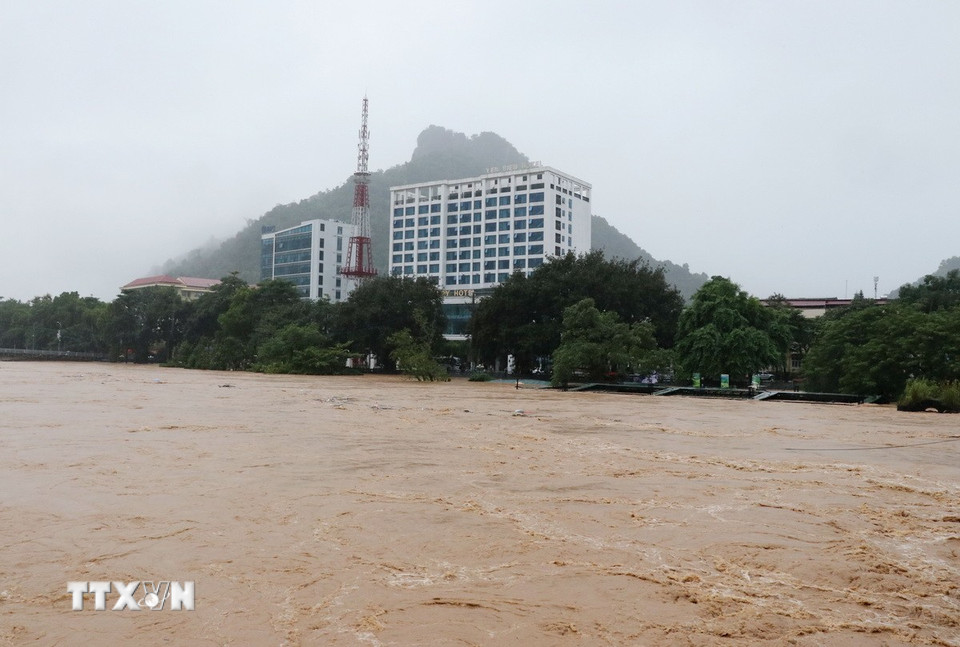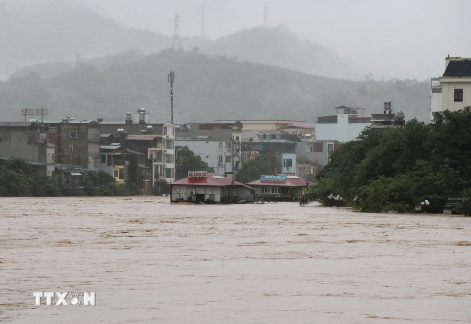 Mực nước trên sông Lô (đoạn qua phường Hà Giang 1) dâng lên rất nhanh, gây ngập lụt trên diện rộng. (Ảnh: Đức Thọ/TTXVN)