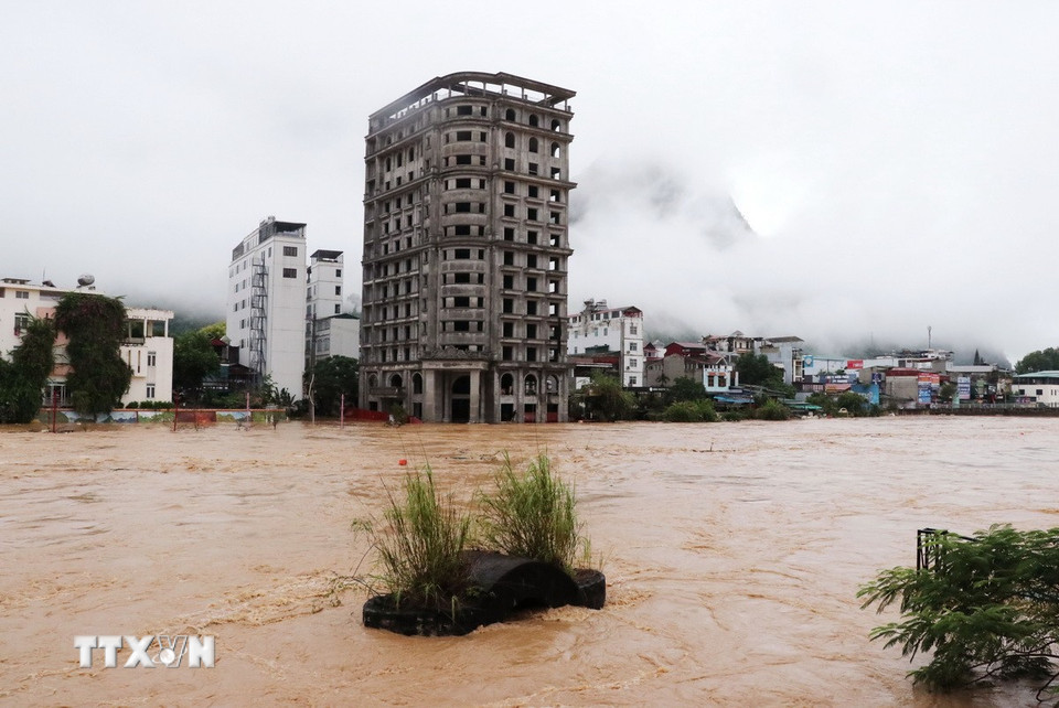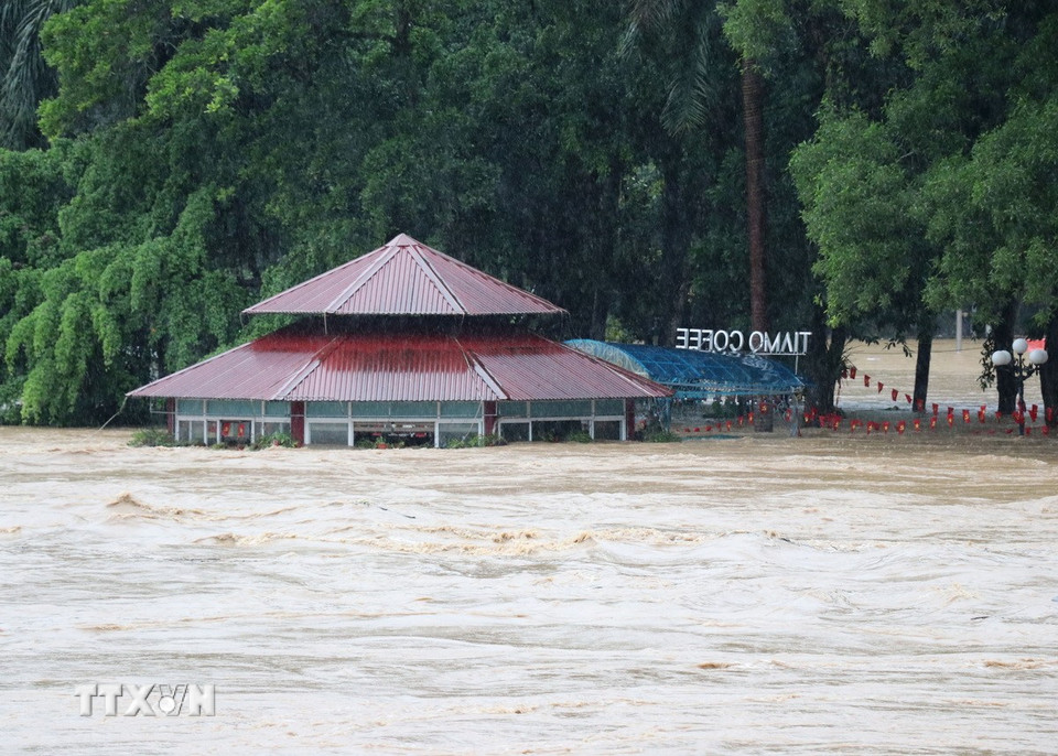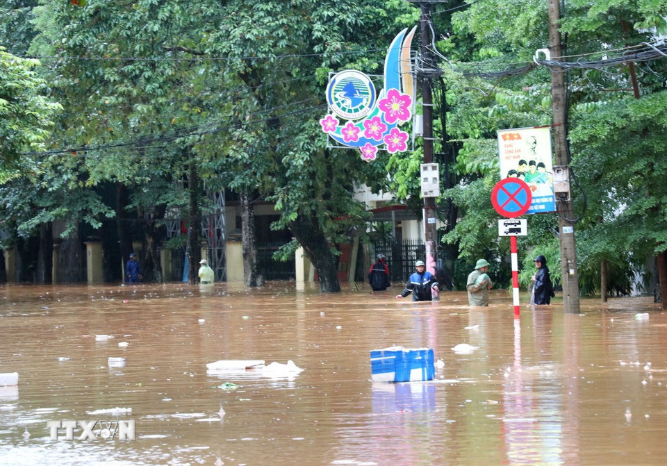 Hàng chục nghìn ngôi nhà chìm trong biển nước từ 1 đến 3 mét, nhiều tuyến đường, Quốc lộ 2 đoạn qua phường Hà Giang 1, 2 bị chia cắt hoàn toàn, giao thông tê liệt. (Ảnh: Đức Thọ/TTXVN)