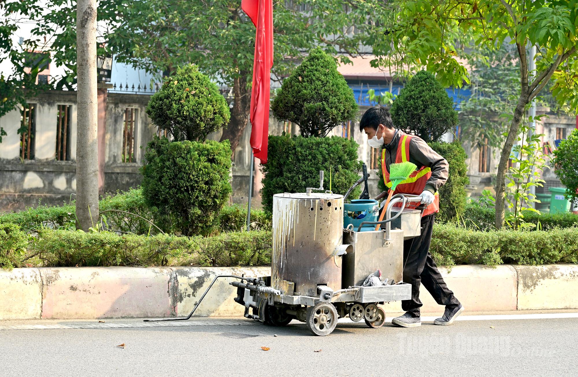 Việc sơn lại vạch kẻ đường đang được đẩy nhanh tiến độ trên tuyến đường Đại lộ Tân Trào.