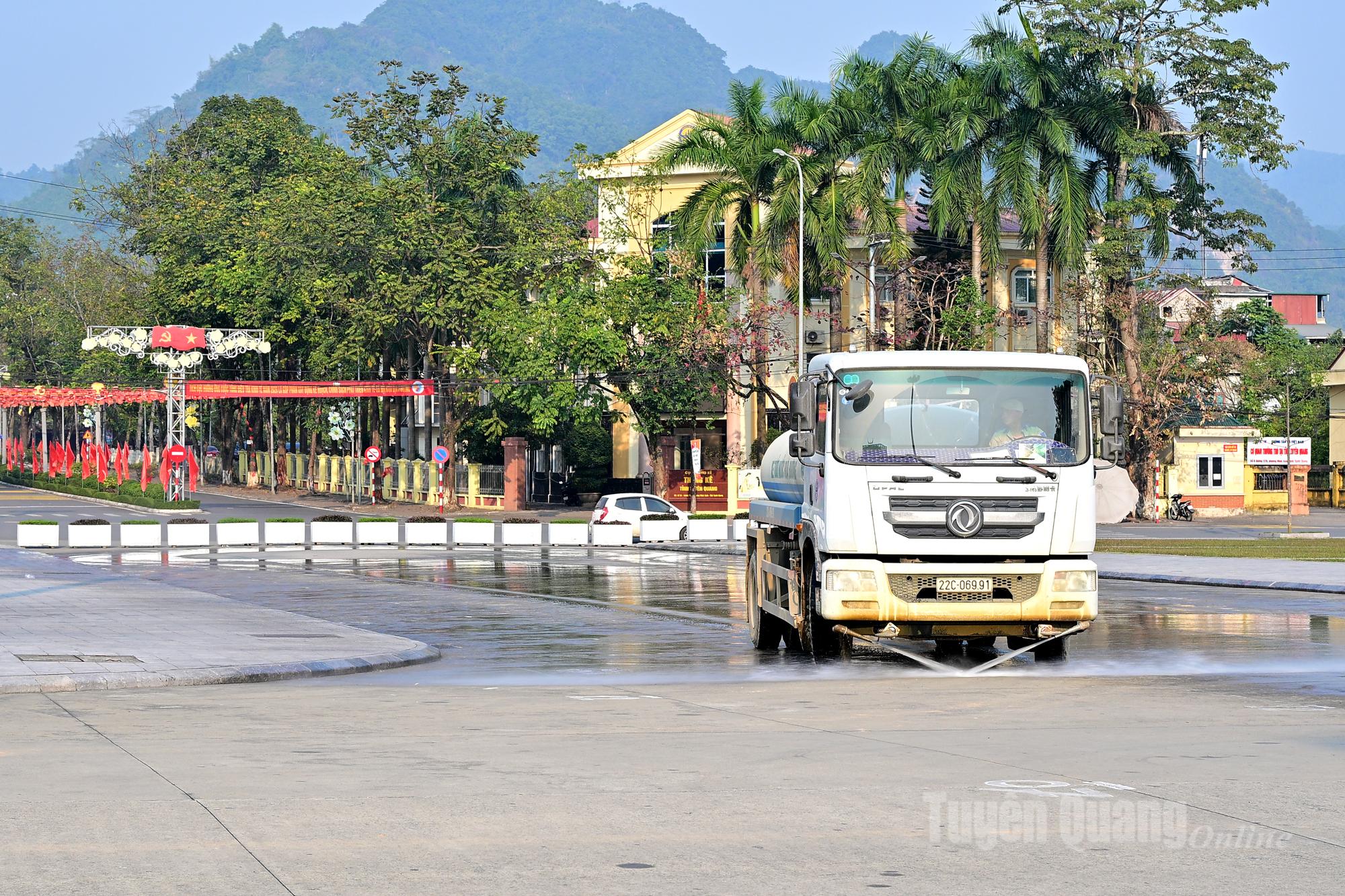 Công tác vệ sinh, phun nước chống bụi tại khu vực Quảng trường Nguyễn Tất Thành được tăng cường.