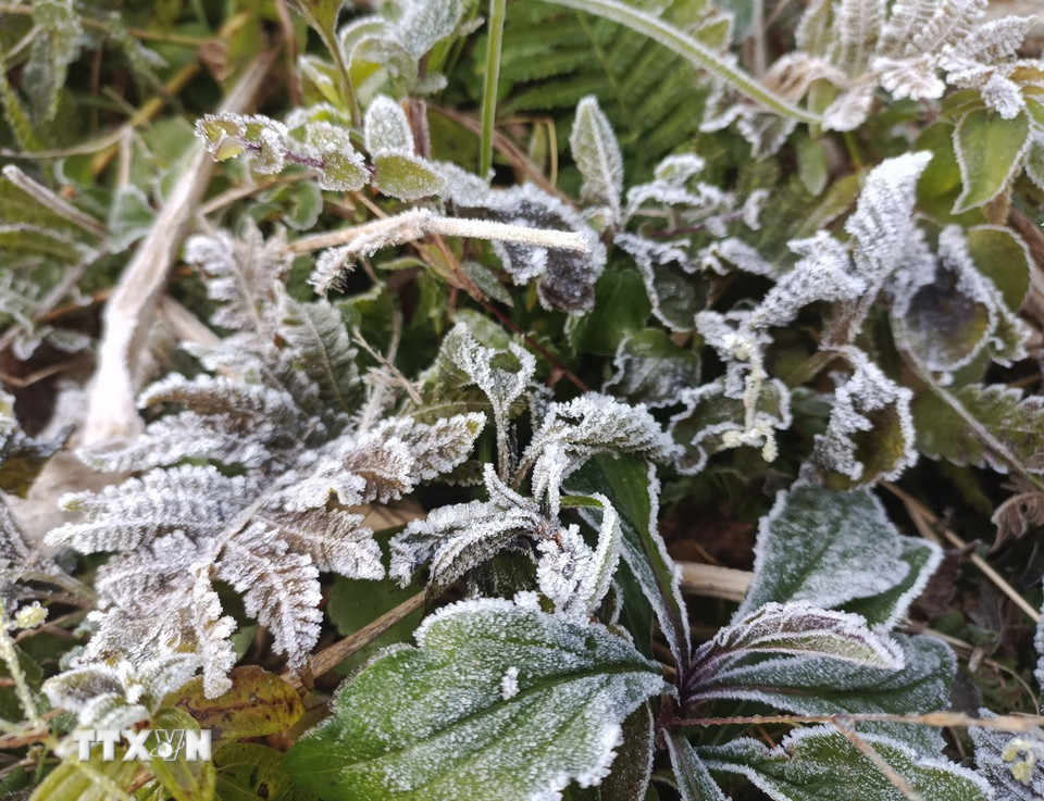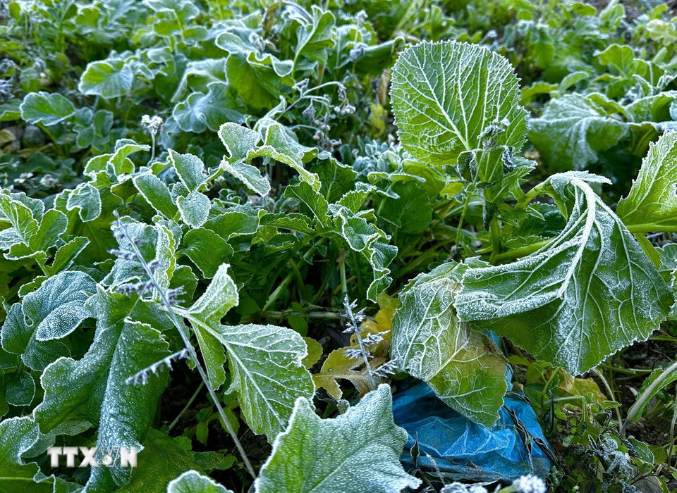 Sương mối tạo thành lớp băng mỏng trên cây cối, rau màu. (Ảnh: Đức Thọ/TTXVN)