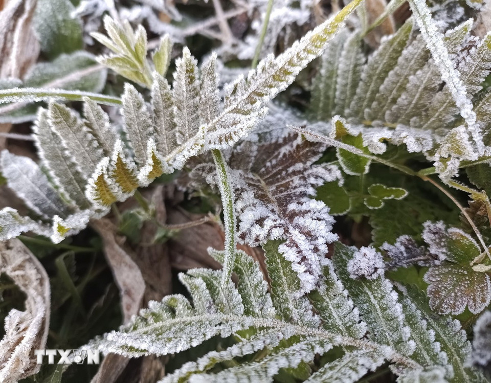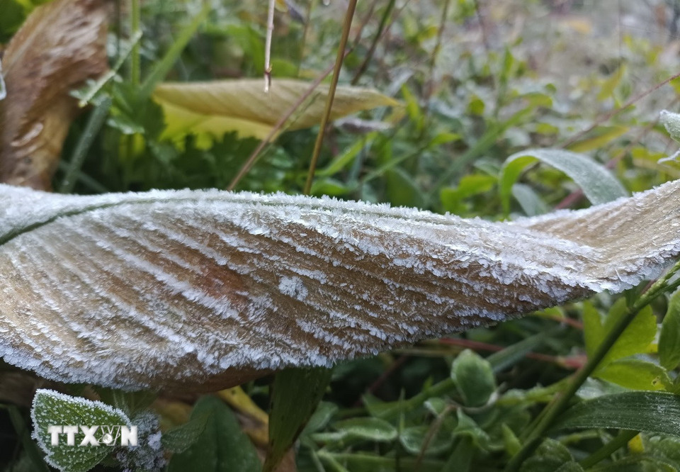Sương mối tạo thành lớp băng mỏng trên cây cỏ. (Ảnh: Đức Thọ/TTXVN)