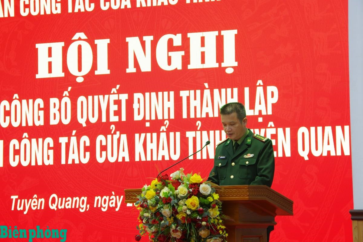 Đại tá Hoàng Ngọc Định, Phó Chỉ huy trưởng Bộ Chỉ huy Quân sự tỉnh, Chỉ huy trưởng Ban Chỉ huy Bộ đội Biên phòng tỉnh Tuyên Quang công bố các quyết định thành lập Tiểu ban cửa khẩu tỉnh Tuyên Quang. Ảnh: Xuân Minh