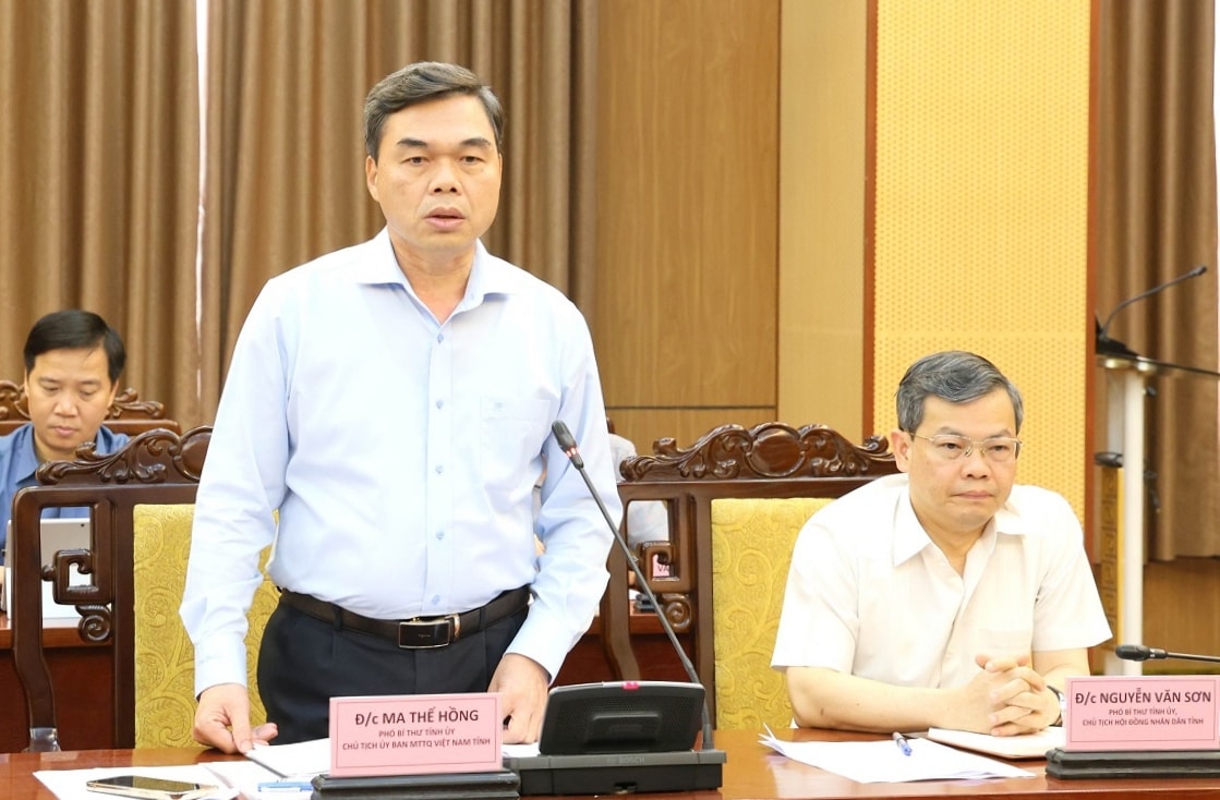 Phó Bí thư Tỉnh ủy, Chủ tịch Ủy ban MTTQ tỉnh Ma Thế Hồng phát biểu tại cuộc họp. Ảnh: CTTĐT