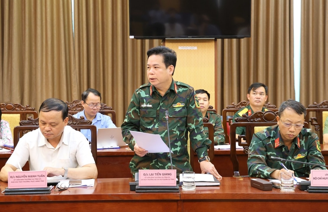 Chỉ huy trưởng Bộ Chỉ huy Quân sự tỉnh, Đại tá Lại Tiến Giang báo cáo công tác phòng, chống mưa lũ. Ảnh: CTTĐT
