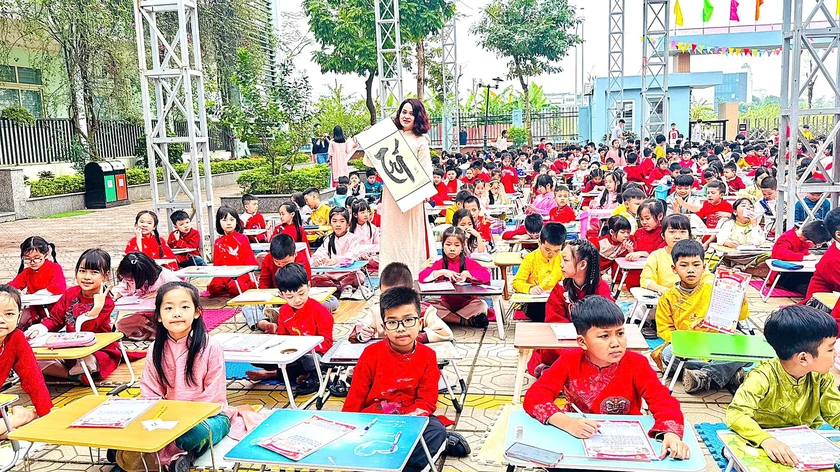 Học sinh được học trường gần nhà là mong muốn tha thiết của phụ huynh. Ảnh: Ngày hội khai bút Xuân Bính Ngọ của cô trò Trường Tiểu học Phú Diễn (Hà Nội)