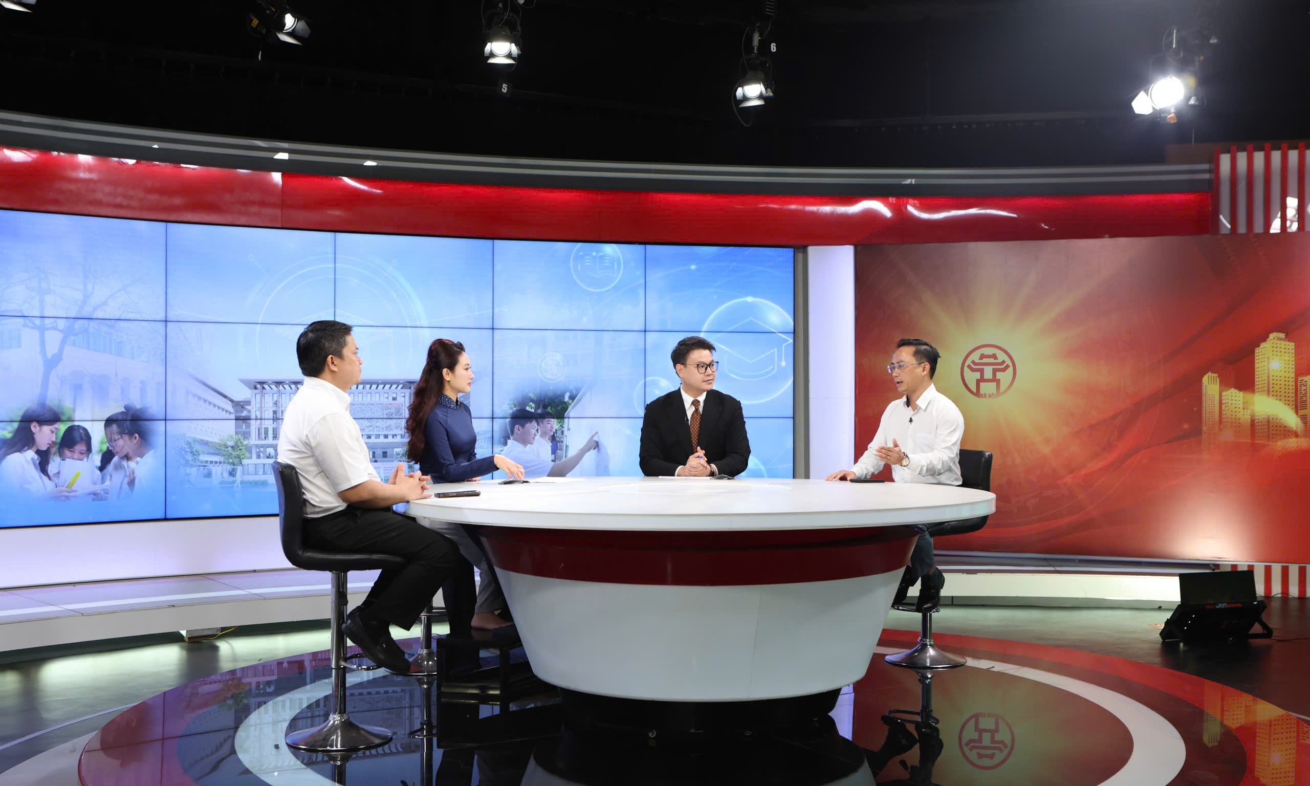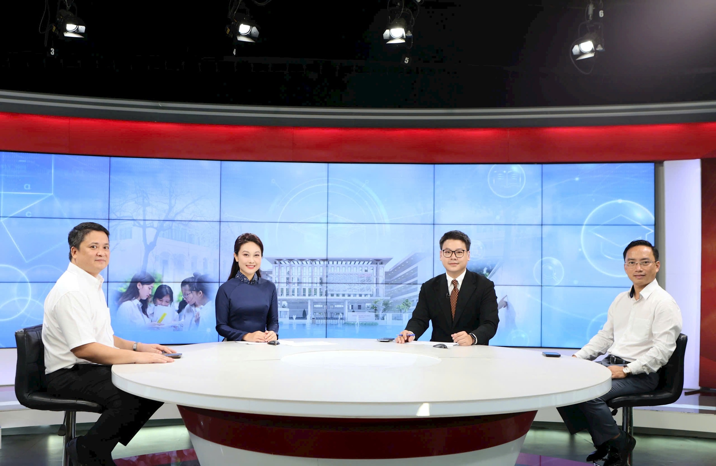 Các khách mời tham gia Chương trình thời sự “Tuyển sinh lớp 10 tại Hà Nội: Giảm áp lực, mở rộng lựa chọn”. Ảnh: Thanh Hải