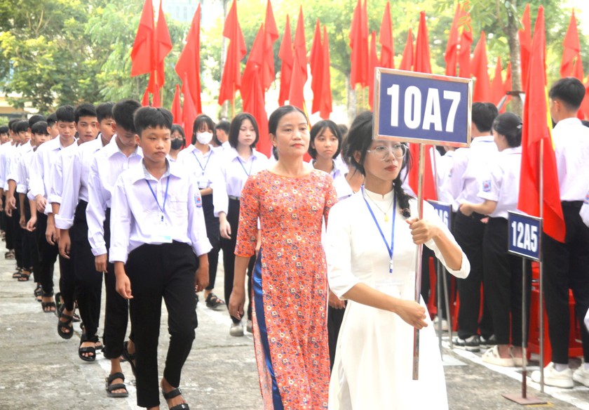Trường Trung học Phổ thông Nguyễn Du (Ninh Bình) chào đón học sinh lớp 10 trong lễ khai giảng năm học mới. Ảnh minh họa