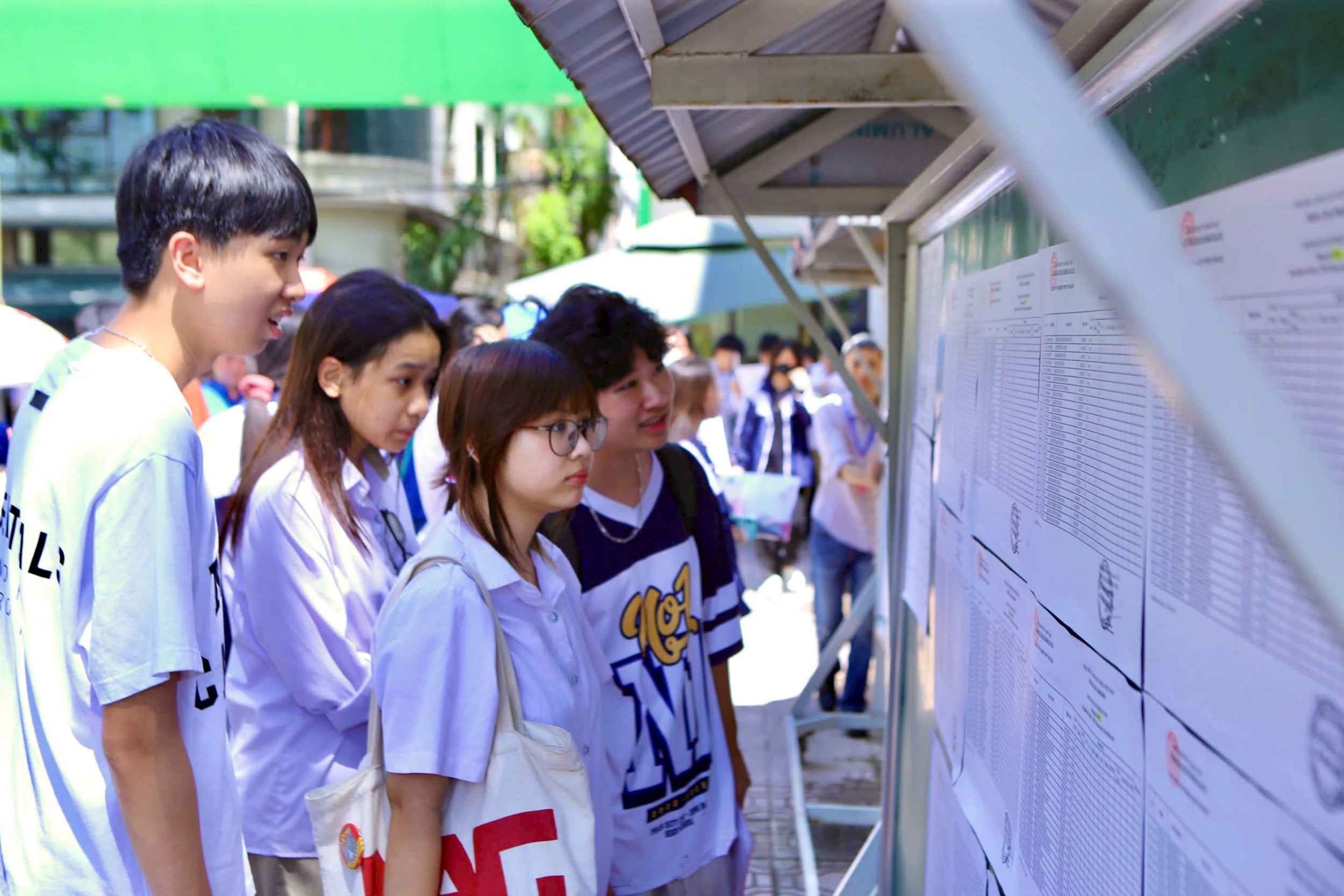 Các thí sinh tìm hiểu thông tin kỳ thi tuyển sinh lớp 10. Ảnh: Quang Thái