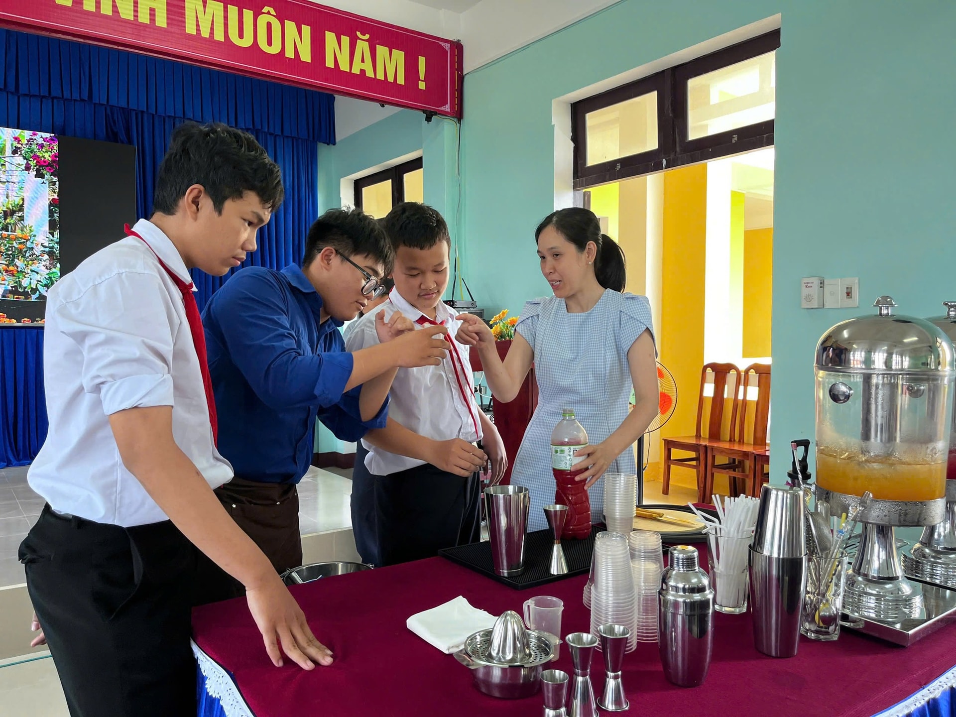 Học sinh Trường THCS Nguyễn Du (phường Hội An Đông) trải nghiệm nghề pha chế. Ảnh: NTCC.