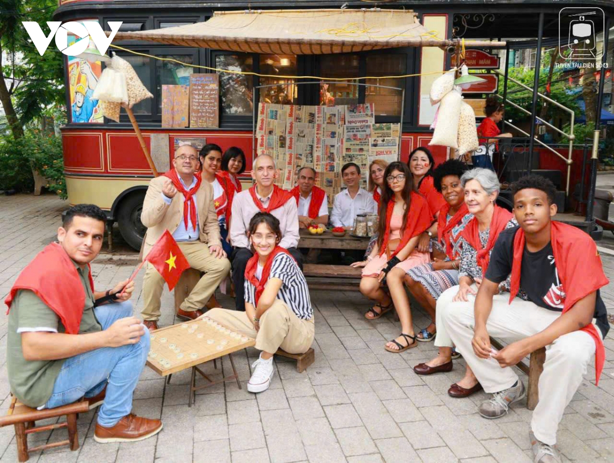 Du khách nước ngoài hào hứng check-in tại "Tuyến tàu điện số 6". Khoảnh khắc ghi lại sự tò mò và thích thú khi họ lần đầu chạm vào không gian ký ức của thủ đô.