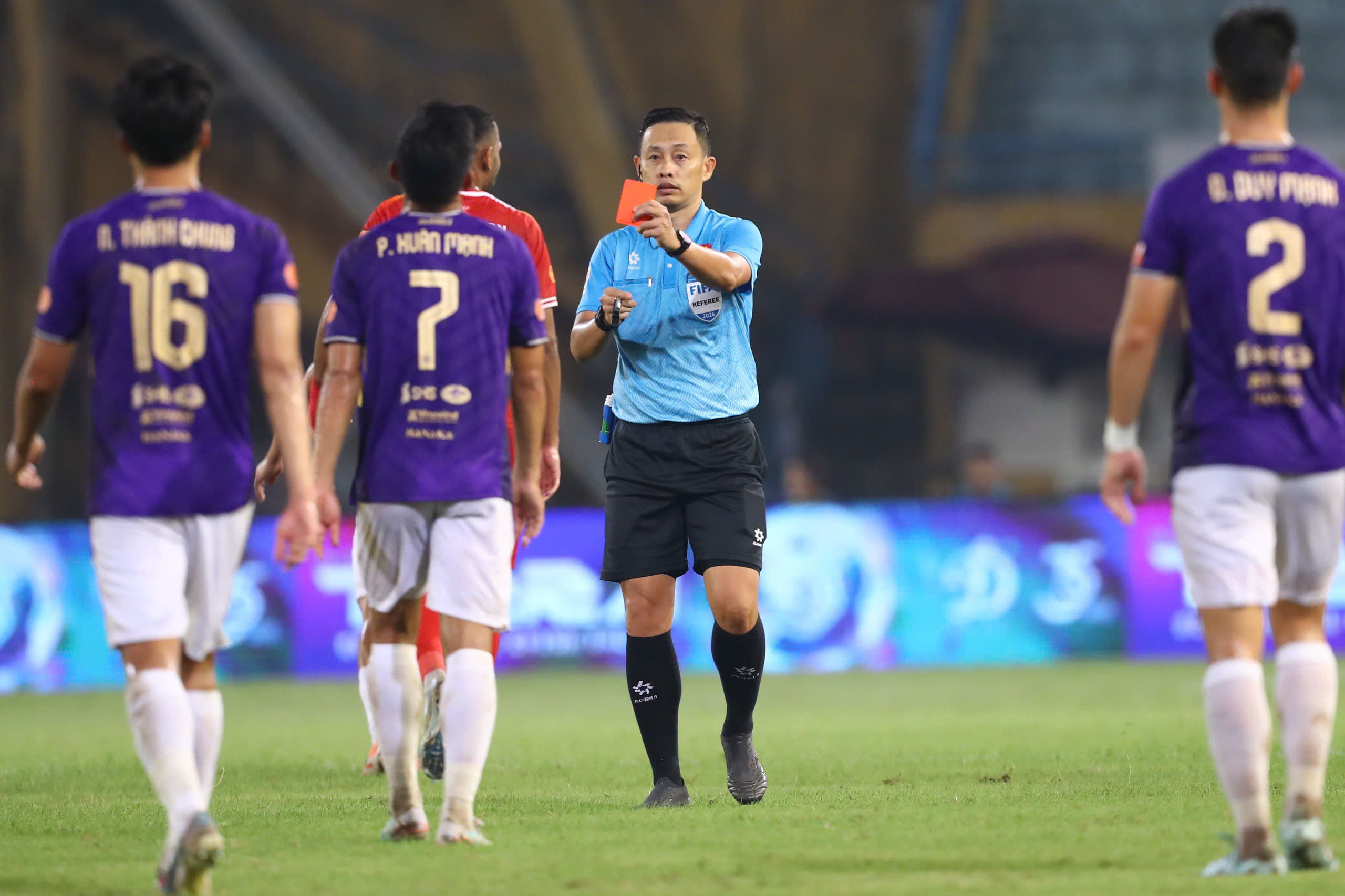 Hà Nội FC không chỉ có Hoàng Hên tỏa sáng mà còn gặp may mắn. Phút 45+1, trung vệ Nguyễn Thành Chung nhận thẻ đỏ trực tiếp từ trọng tài Ngô Duy Lân khi kéo ngã Atshimene trong tình huống tiền đạo Hà Tĩnh đang băng xuống đối mặt thủ môn. Tuy nhiên, công nghệ VAR đã can thiệp, giúp trọng tài xem lại và xác định bóng đã chạm tay Joseph Onoja của Hà Tĩnh trước khi đội khách tổ chức tấn công. Vì vậy, thẻ đỏ của Thành Chung được hủy và Hà Nội FC tiếp tục thi đấu đủ người.