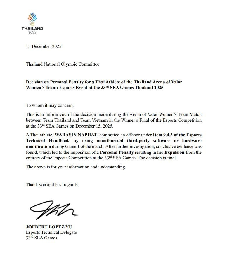 Hiệp hội Thể thao Điện tử Thái Lan xác nhận Naraphat đã vi phạm Điều 9.4.3, sử dụng phần mềm bên thứ ba không được cấp phép hoặc can thiệp, chỉnh sửa quá trình thi đấu trong ván 1 của trận Chung kết nhánh thắng giữa đội tuyển Thái Lan và đội tuyển Việt Nam, diễn ra vào ngày 15/12/2025.