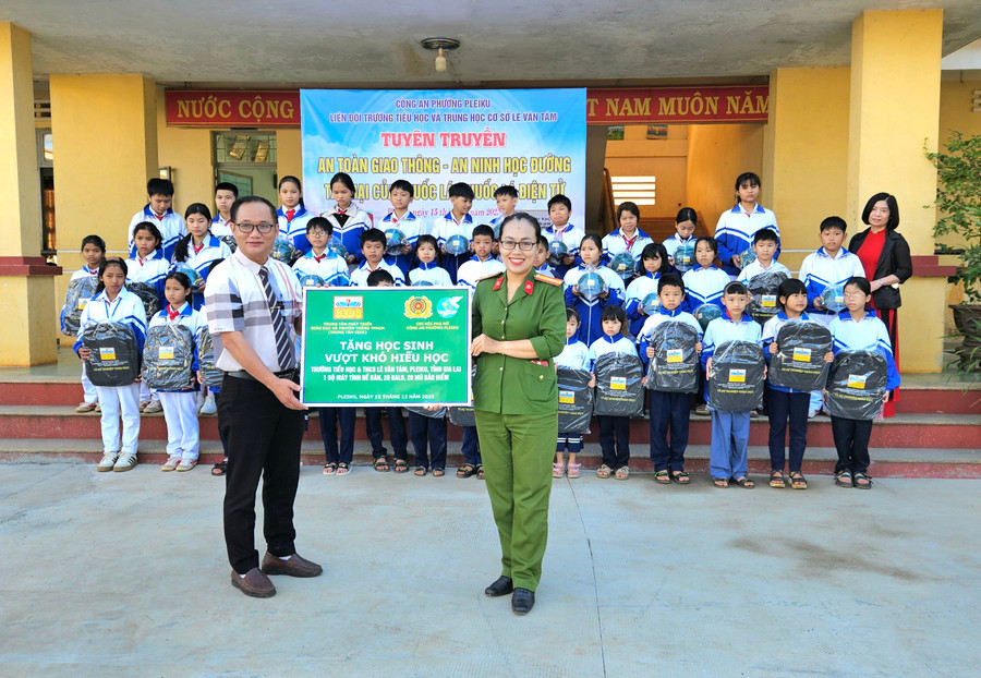 Dịp này, Trung tâm phát triển Giáo dục và Truyền thông (TP. Hồ Chí Minh) trao tặng cho Trường Tiểu học và THCS Lê Văn Tám (phường Pleiku) 1 bộ máy vi tính để bàn, 20 ba lô và 20 mũ bảo hiểm dành cho học sinh vượt khó hiếu học. Tổng trị giá quà tặng gần 20 triệu đồng.