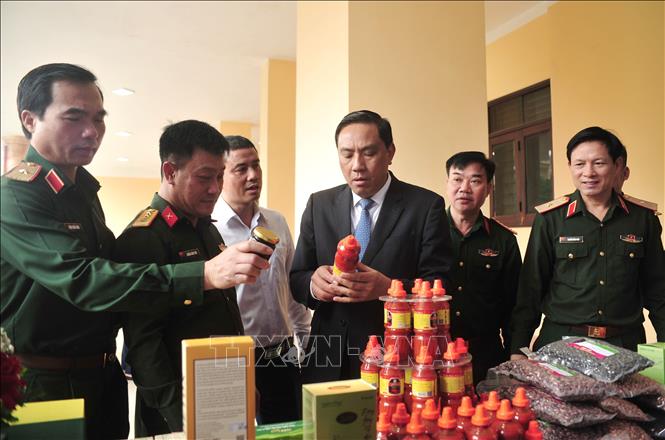 Lãnh đạo Quân khu 2 cùng lãnh đạo tỉnh Lào Cai tham quan các sản phẩm OCOP được trưng bày tại hội nghị.