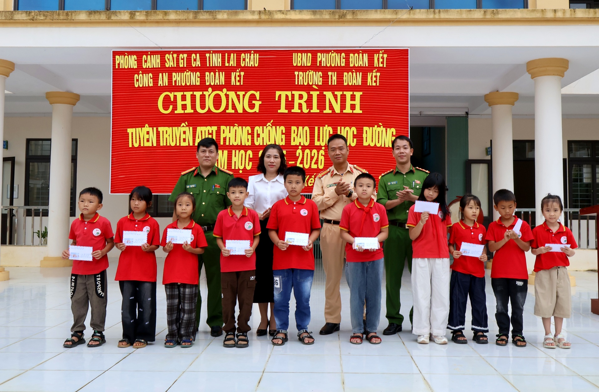 Nhân dịp này, Đội Tuyên truyền, Điều tra giải quyết tai nạn và Xử lý vi phạm đã tặng 10 phần quà cho học sinh có hoàn cảnh khó khăn của nhà trường. Những món quà tuy nhỏ nhưng chứa đựng tình cảm, sự quan tâm và động viên của lực lượng Cảnh sát Giao thông, góp phần khích lệ tinh thần học tập cho các em.