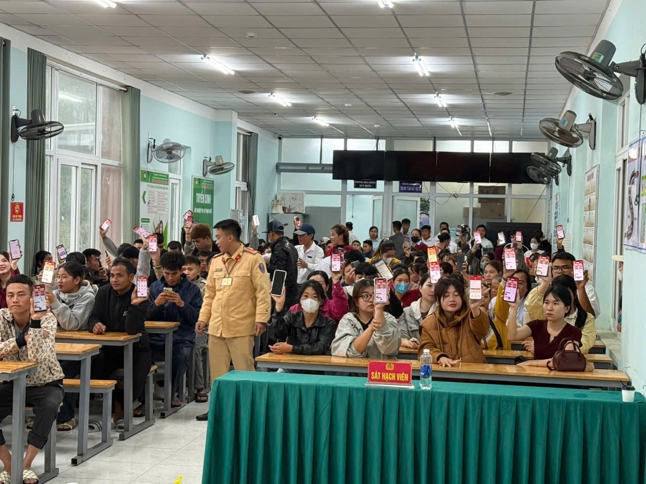 Cán bộ Phòng CSGT hướng dẫn các thí sinh tham gia thi sát hạch lái xe ở khu vực Phan Thiết cài đặt ứng dụng VneTraffic