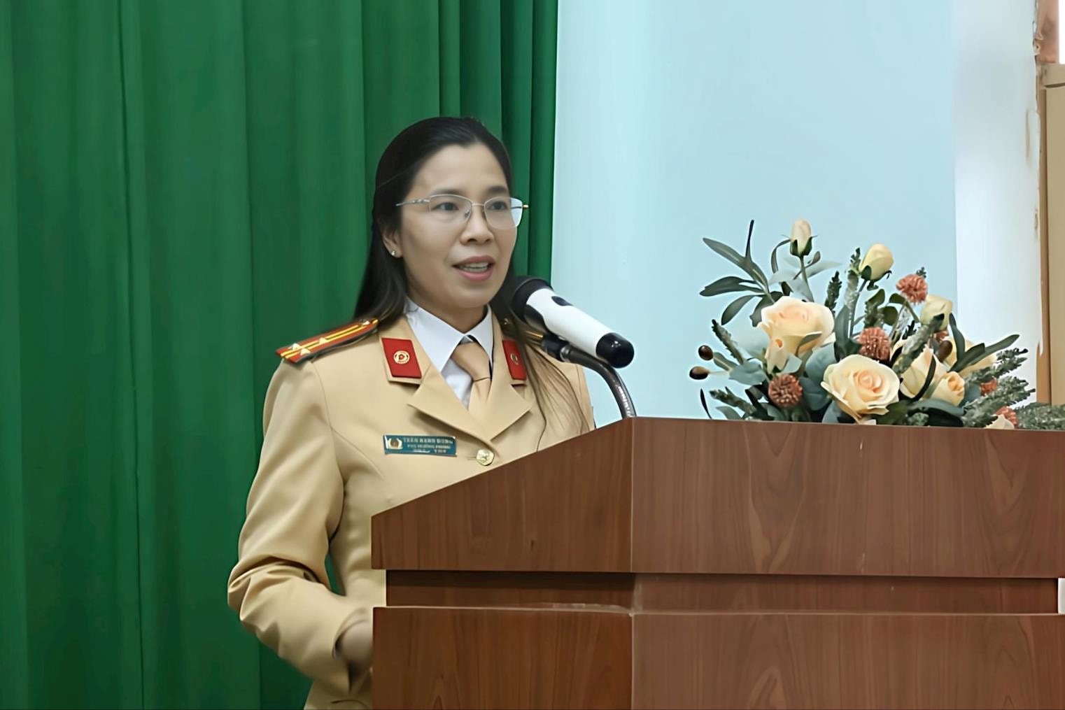 Thượng tá Trần Hạnh Dung, Phó Trưởng phòng CSGT giới thiệu các tiện ích của ứng dụng VneTraffic đến các học viên, thí sinh