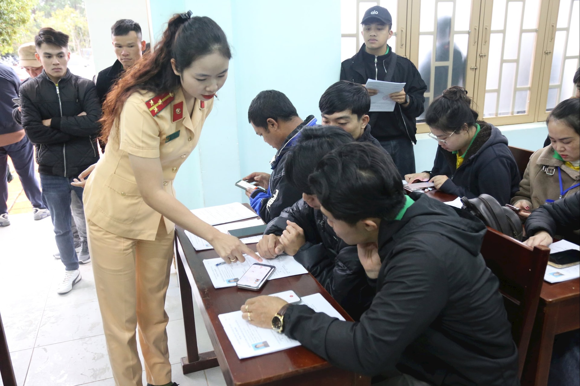 Cán bộ Phòng CSGT hướng dẫn các thí sinh tham gia thi sát hạch lái xe ở khu vực Đà Lạt cài đặt ứng dụng VneTraffic