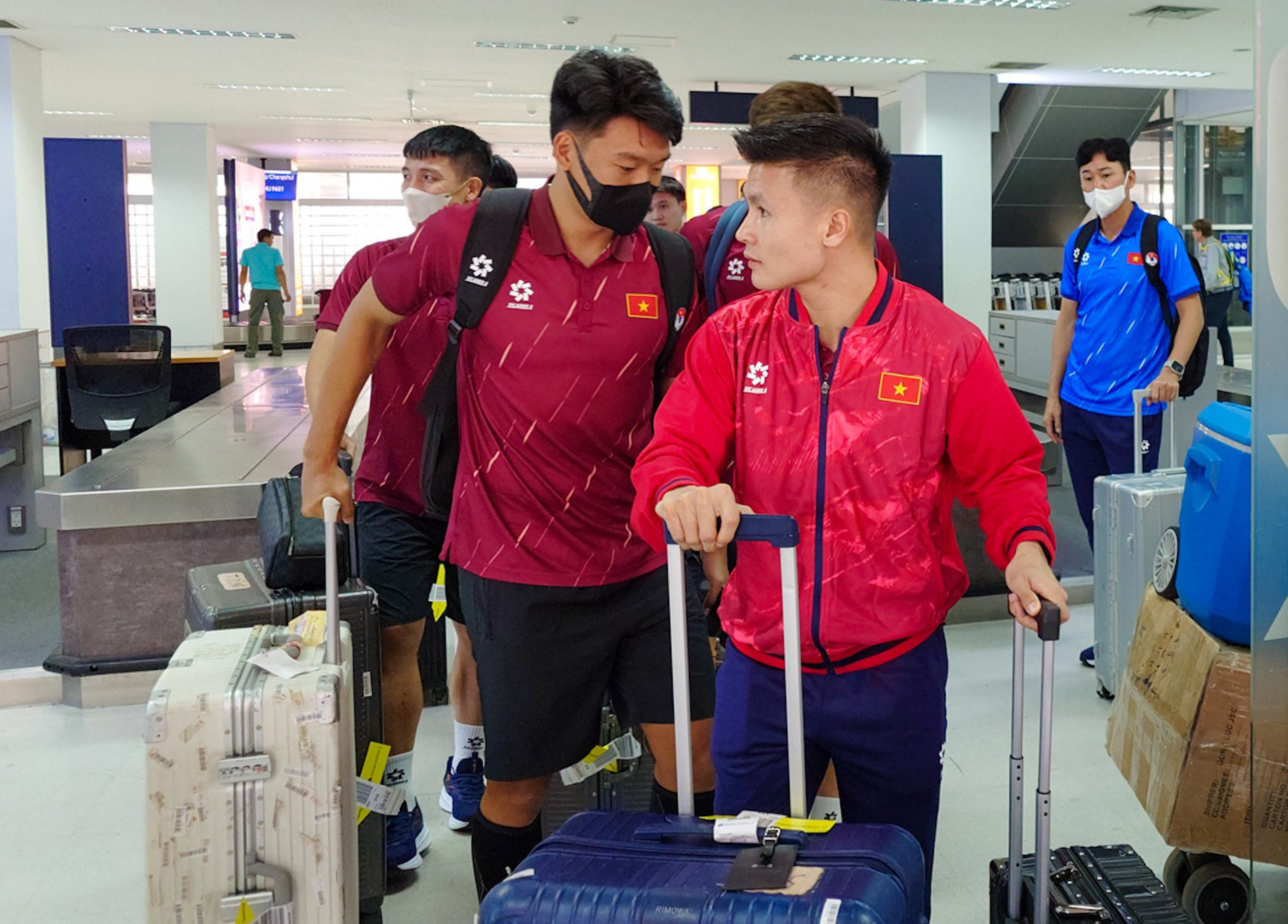 Quang Hải và các đồng đội lấy hành lý, di chuyển tới khu vực nhập cảnh.
