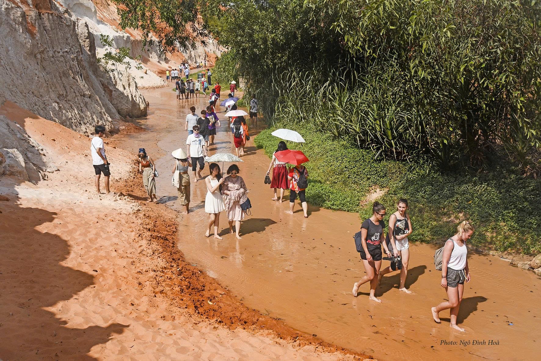 Chỉ dài chừng hơn 1 km, nhưng dòng suối màu cam đỏ mềm mại len dưới chân các vách sa thạch tầng tầng lớp lớp lại khiến bao người ngỡ ngàng. Với nhiều du khách, đây là “điểm phải đến một lần trong đời” khi ghé Phan Thiết - Mũi Né. Điều đặc biệt ở nơi đây không phải tiếng sóng mà là tiếng suối róc rách hiền hòa; không phải màu biển xanh thẳm mà là gam đỏ cam kỳ ảo của đất đá. Cả con suối giống như một dòng sữa màu gạch, lấp lánh dưới nắng, tạo nên khung cảnh vừa thơ mộng vừa lạ mắt.