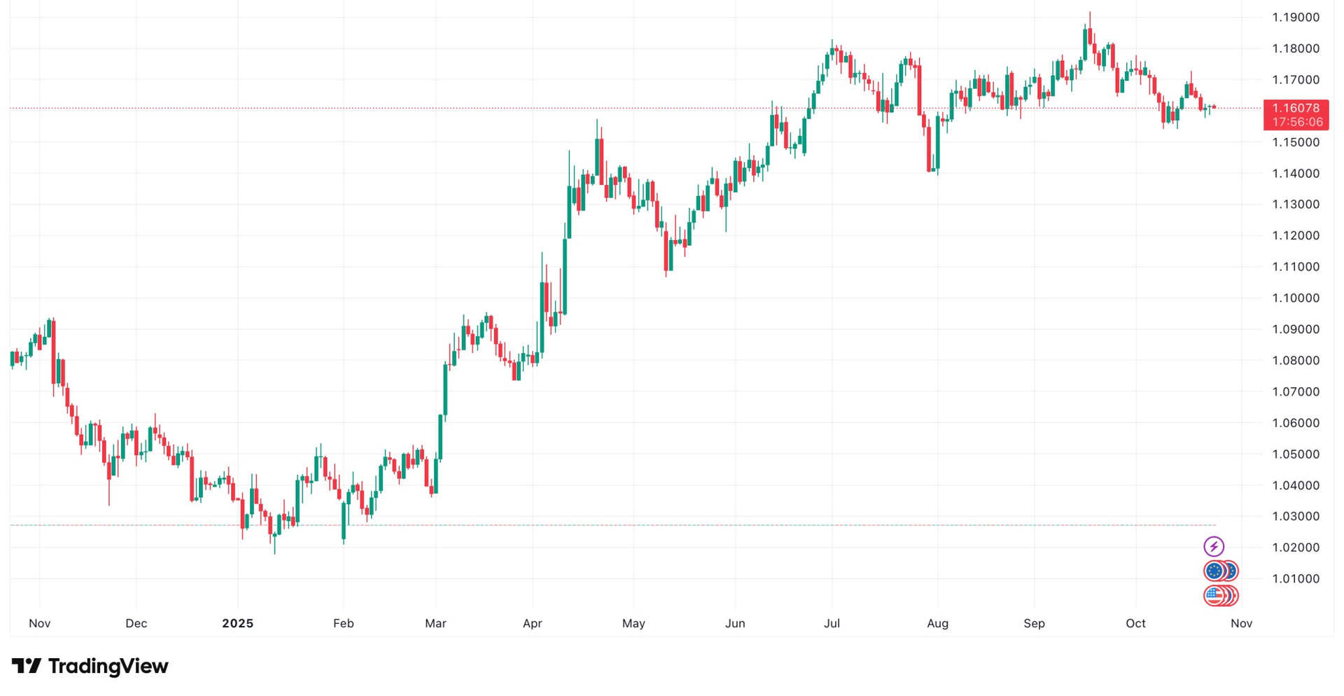 Diễn biến tỷ giá EUR/USD từ đầu năm đến ngày 24/10/2025. (Nguồn: TradingView)