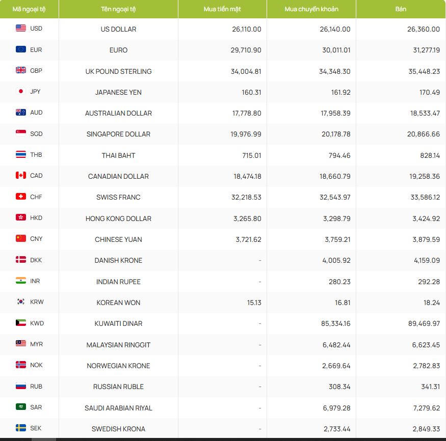 Đáng chú ý, nhiều đồng tiền không được niêm yết giá mua tiền mặt, chủ yếu giao dịch qua hình thức chuyển khoản như krone Đan Mạch (DKK), rupee Ấn Độ (INR), dinar Kuwait (KWD) hay krona Thụy Điển (SEK).