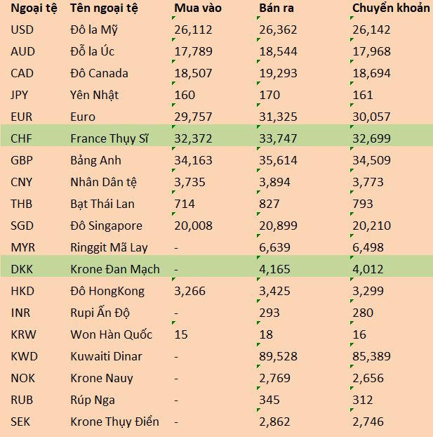 Một số ngoại tệ không có giá mua vào, chủ yếu niêm yết ở chiều bán ra như ringgit Malaysia (MYR) ở mức 6.639 đồng, krone Đan Mạch (DKK) 4.165 đồng hay rupi Ấn Độ (INR) 293 đồng. Đáng chú ý, dinar Kuwait (KWD) mức bán ra lên tới 89.528 đồng.