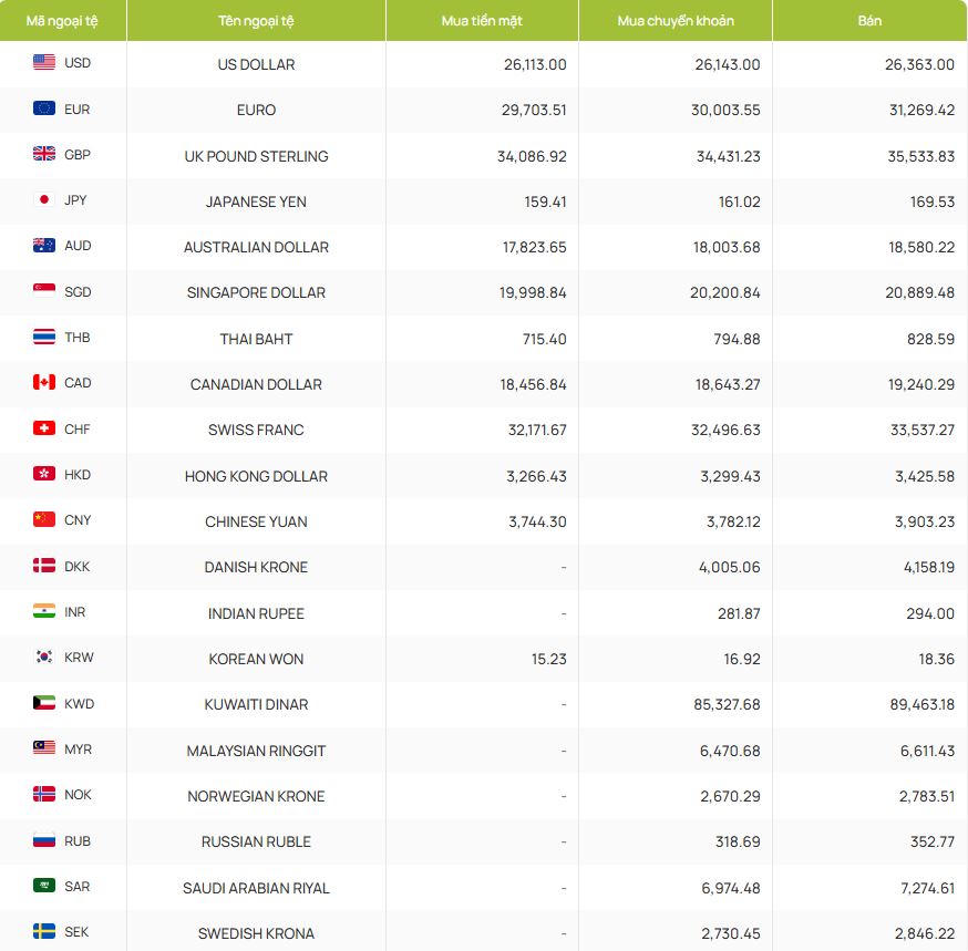 Đồng USD được niêm yết với giá mua tiền mặt 26,113.00 đồng, mua chuyển khoản 26,043.00 đồng và bán ra 26,363.00 đồng.