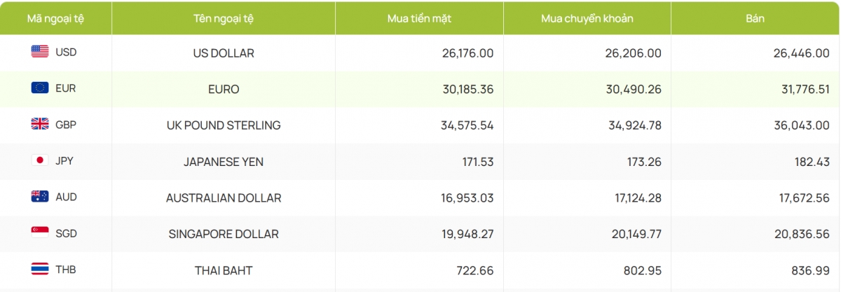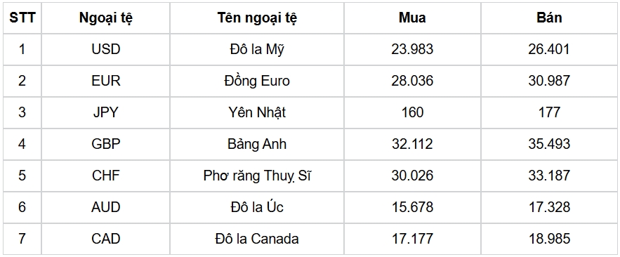Tỷ giá các ngoại tệ mạnh khác trong giỏ thanh toán quốc tế, tại Ngân hàng Vietcombank được niêm yết như sau: