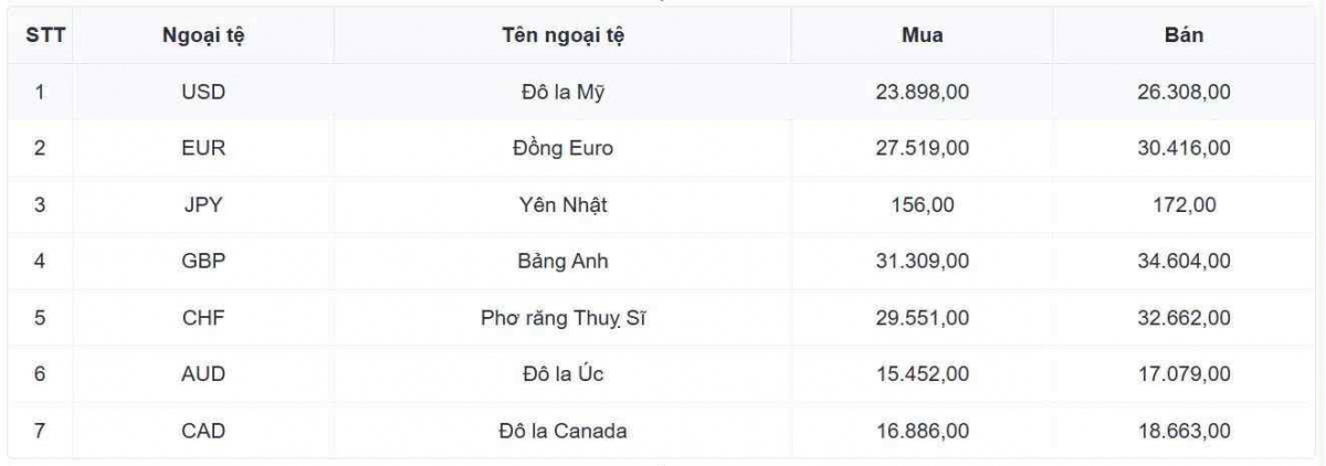 Tỷ giá các ngoại tệ mạnh khác trong giỏ thanh toán quốc tế, tại Ngân hàng Vietcombank được niêm yết như sau: